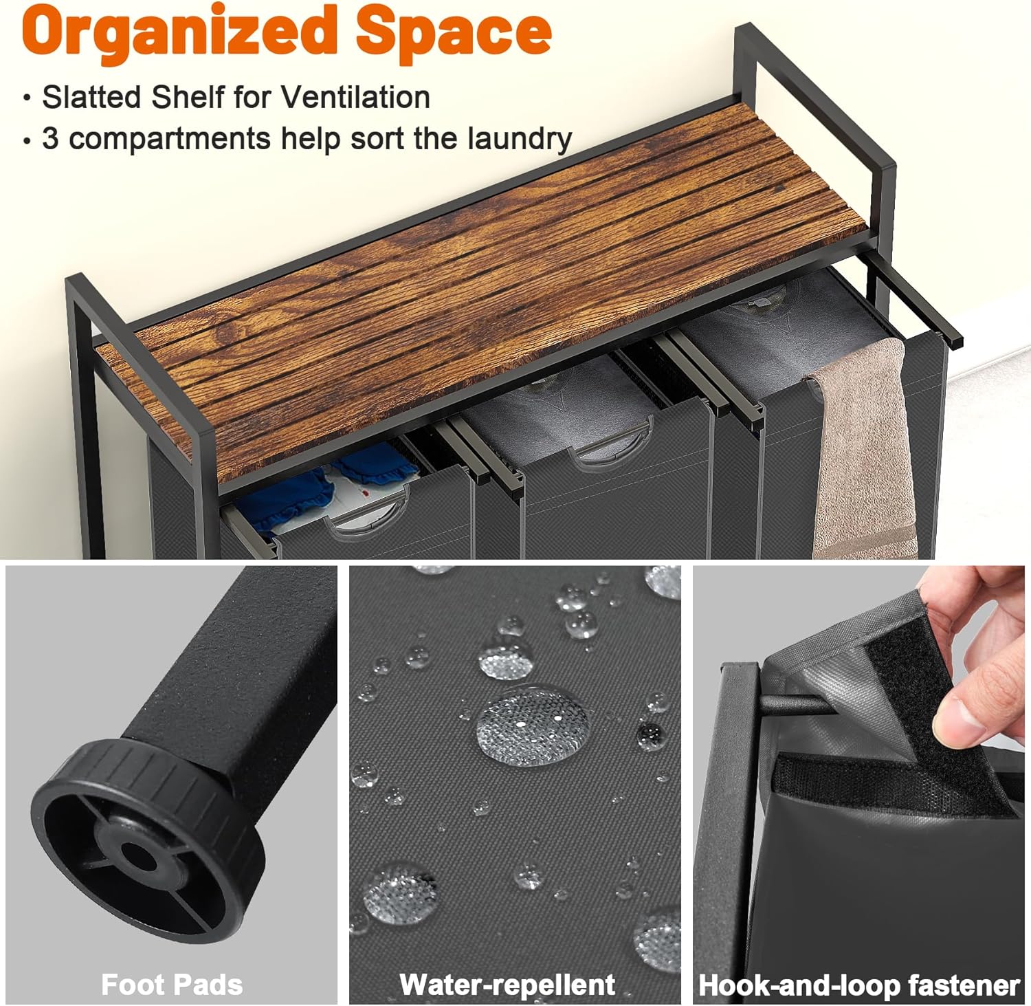 Laundry Hamper, Laundry Sorter with 3 Pull-Out Removable Oxford Fabric Bags Cloth Laundry Basket 3 x 10 Gallons (Grey and Rustic Brown)