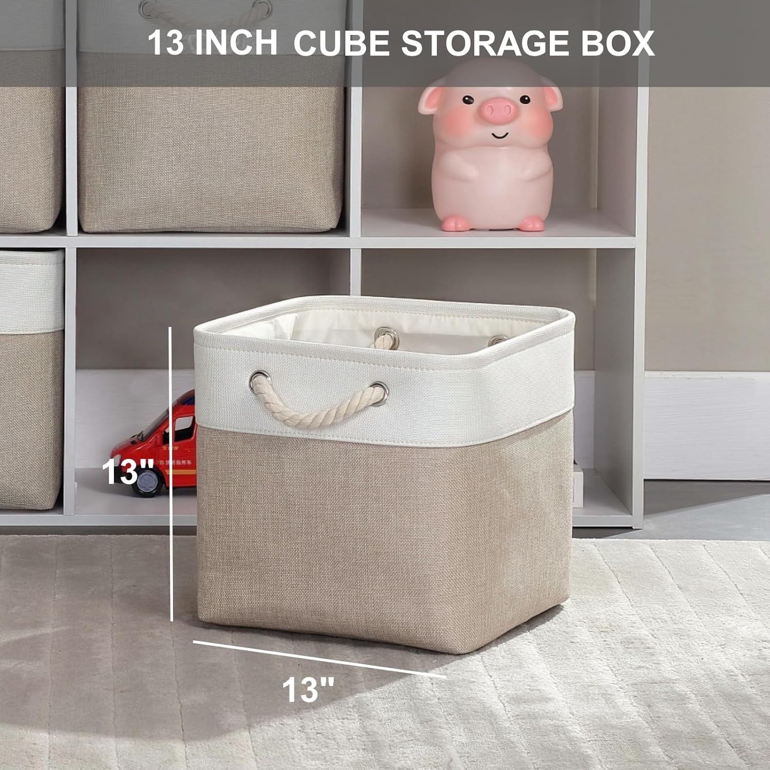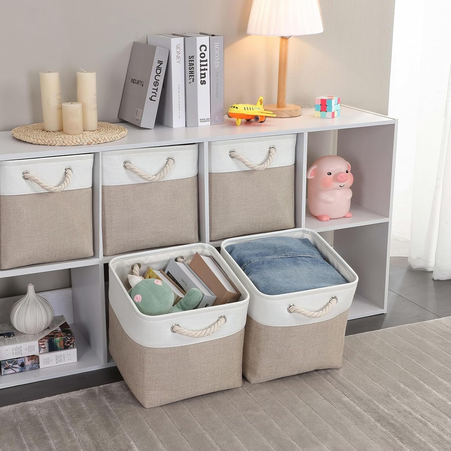 Mangata Canvas Storage Boxes, 13 Inch Cube Storage Bins Set of 6, Fabric Baskets with Cotton Rope Handle for Organizing Clothes Nursery Home (Khaki/White)