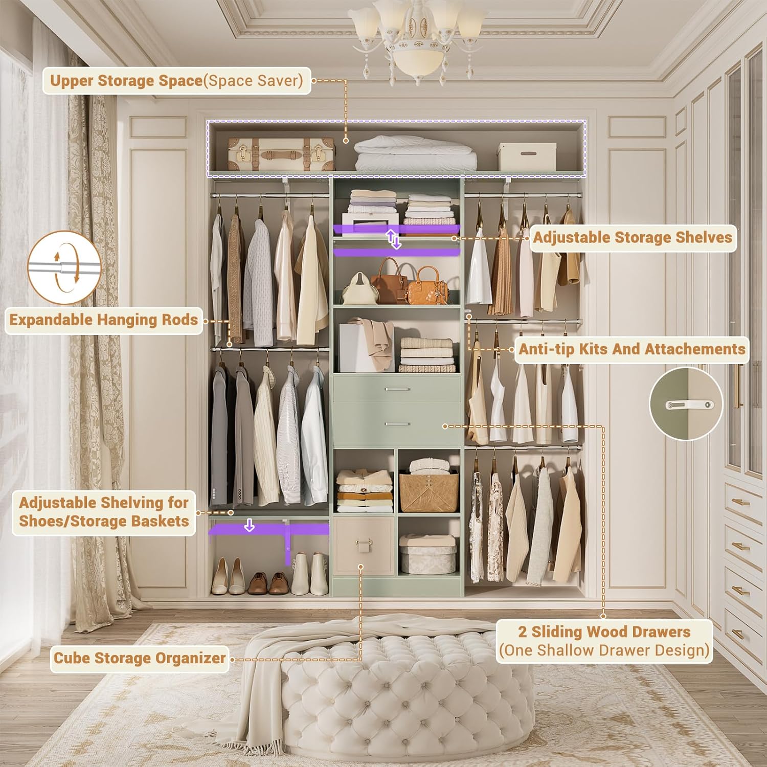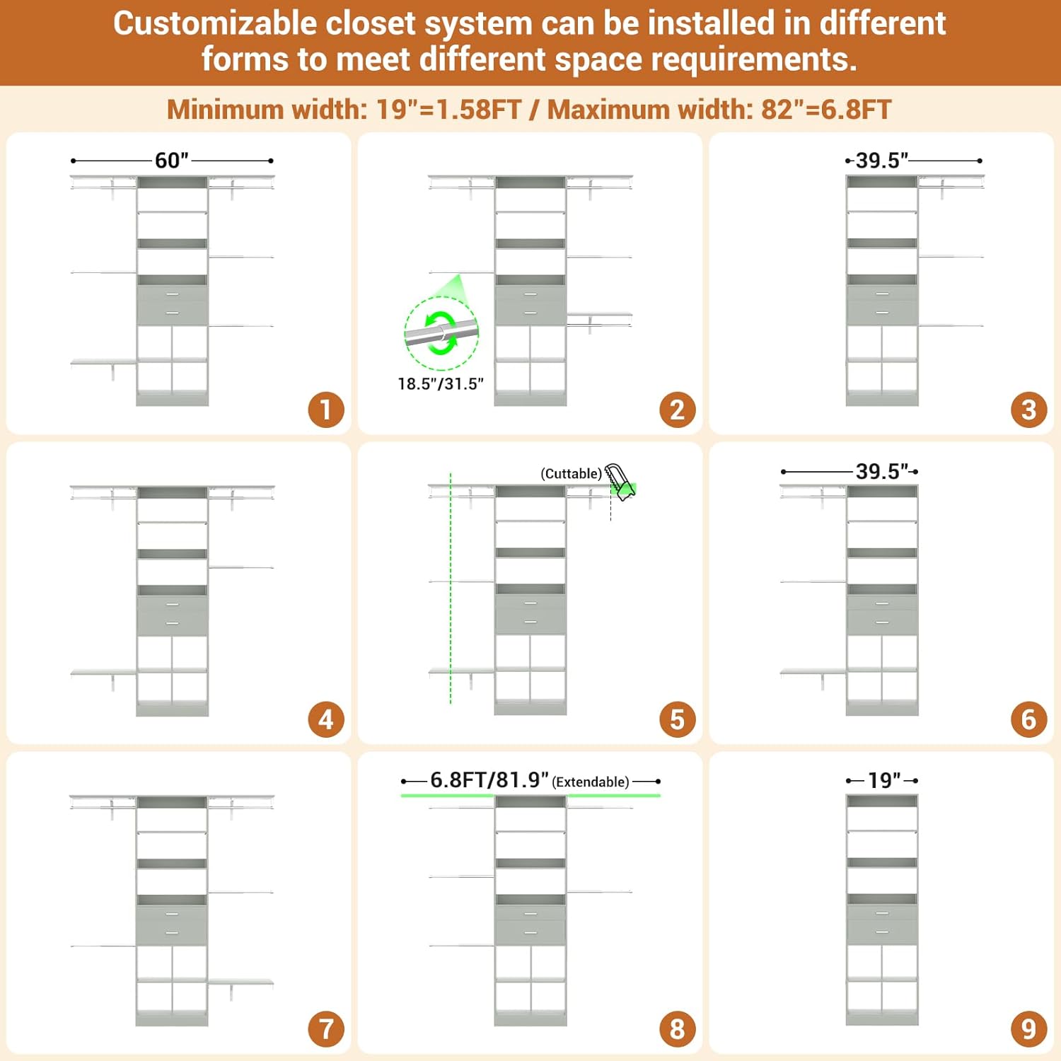 - Customizable Closet System - Besiost closet system with drawers is a valuable addition to your nursery organization and walk-in closets. The small modern closet comes with additional cuttable shelves and adjustable hanging rods, designed to fit well in nurseries of varying sizes.