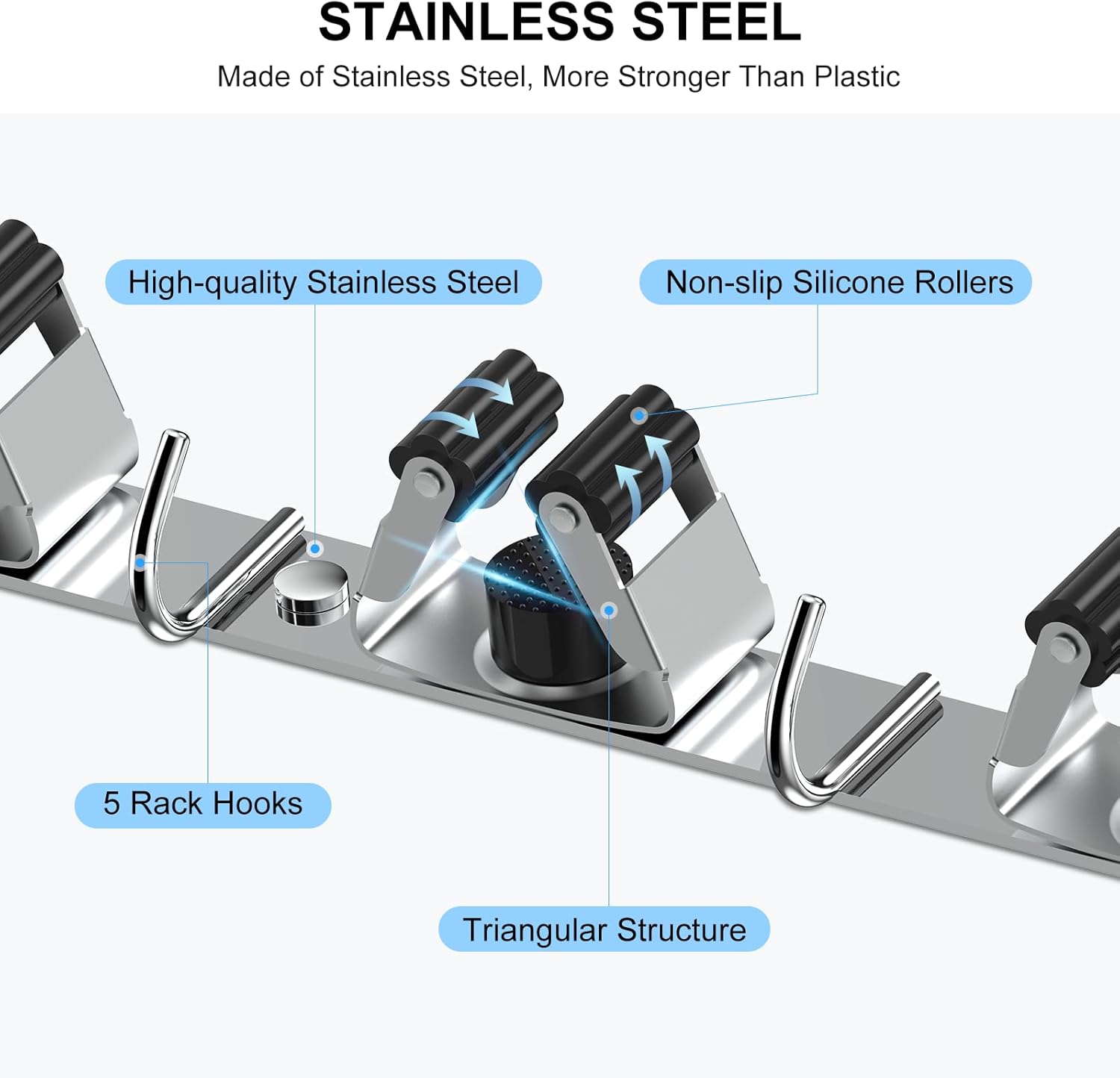 - STURDY BROOM HOLDER: Each mop and broom holder wall mount comes with 4 shelves and 5 hooks, made of high-quality stainless steel, corrosion-resistant, rust-proof, waterproof, and has a longer service life. High-quality materials make it both lightweight and durable