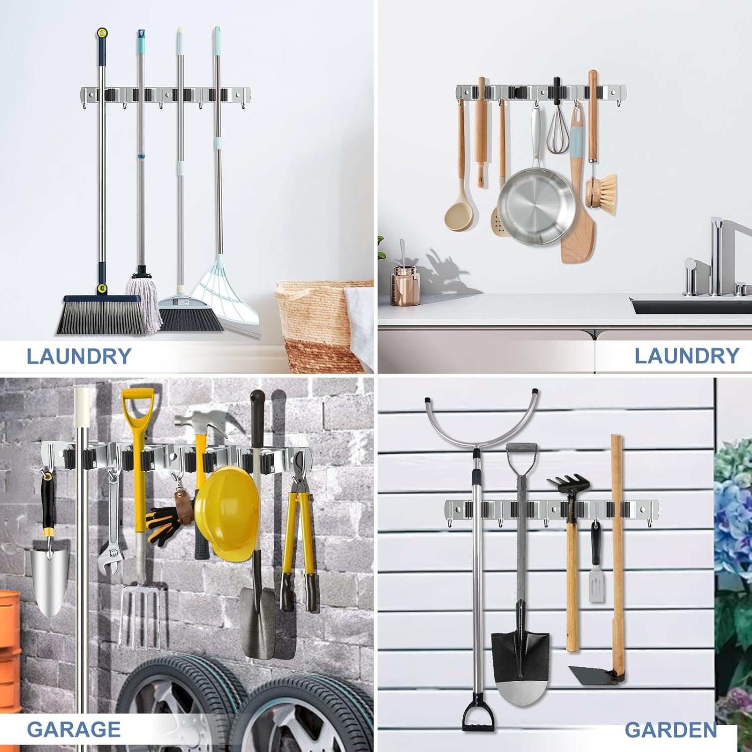 - VERSATILE DESIGN: You can easily organize your home, such as laundry room, kitchen, garage, storage room. This garage organization is also suitable for garden or shed. You can easily use broom, mop, vacuum, dustpan, rake, shovel, etc. Will keep your house clean and tidy