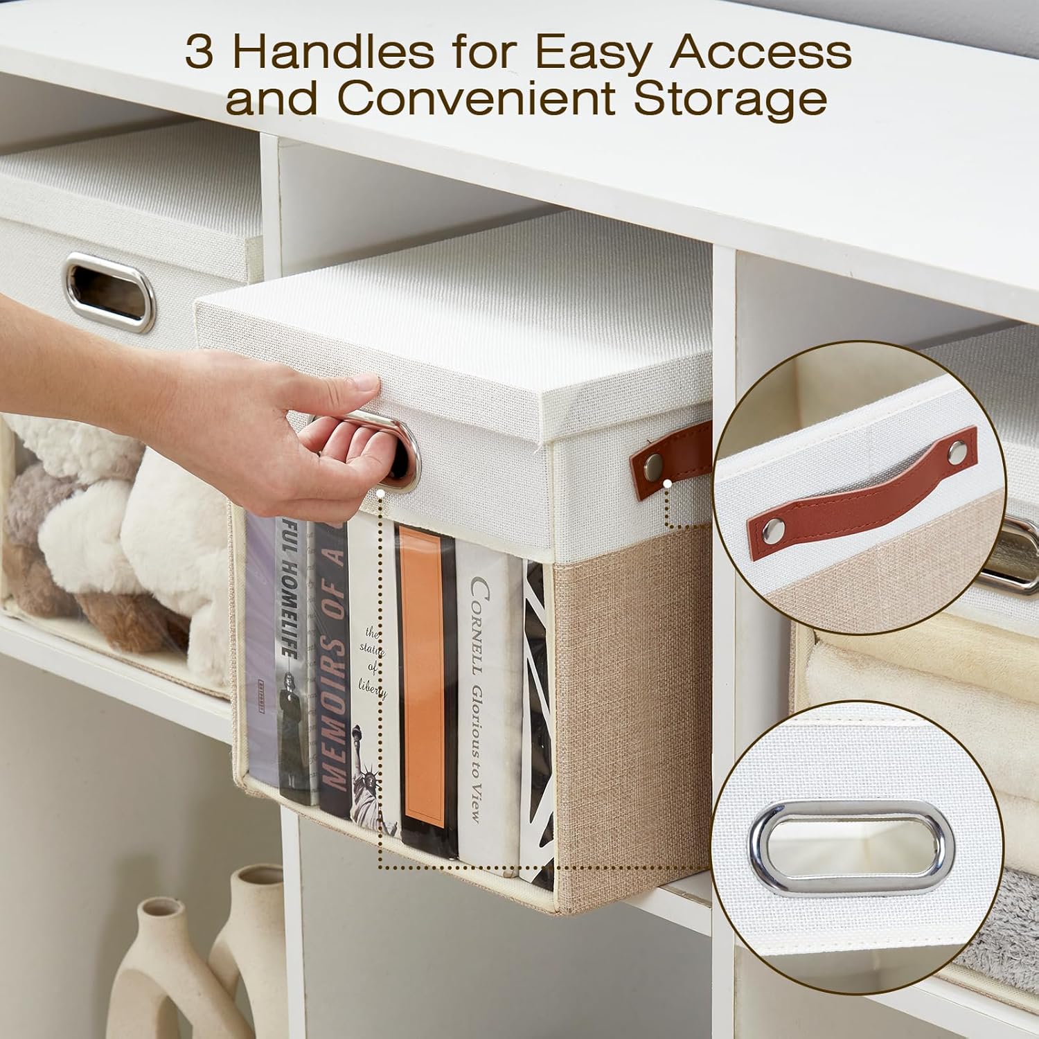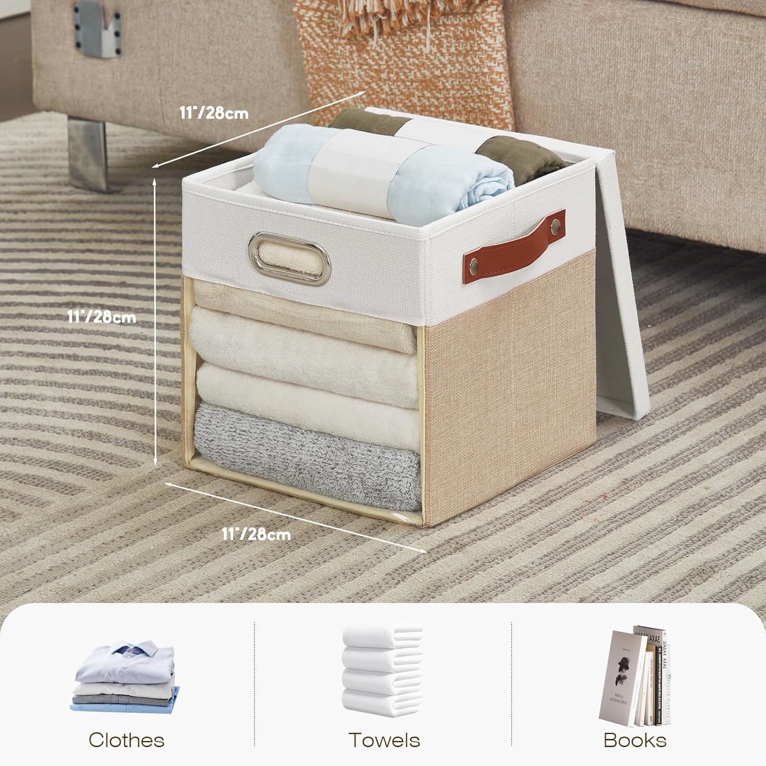 Fabric Storage Cubes with Clear Windows and Lids 11'' Foldable Storage Bins with 3 Handles, Decorative Storage Boxes for Home, Bedroom, Closet, Office (Beige & White)