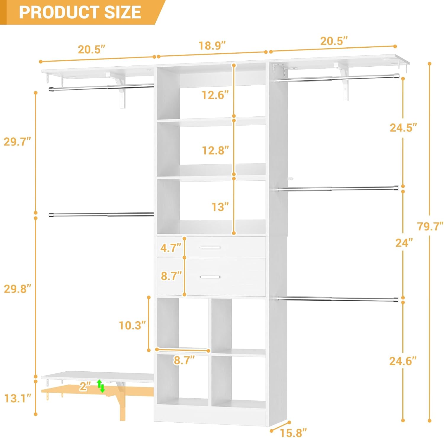 - Super Space Saver - The shelves and hanging rods are sturdy. 3 extra shelving(including lower shoe rack shelving) + 5 hanging rods + 3 adjustable shelves + 2 drawers + 4 cube storage organizer shelves provide ample space for organizing your belongings. The system has effectively maximized the storage capacity of the closet, making it easier to keep everything tidy and accessible.