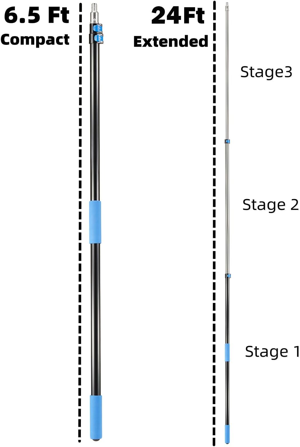 - Comes with a telescopic pole which is made of lightweight sturdy aluminum and features easy flip-tab lock mechanism for adjusting to any custon length from 6 to 24ft.