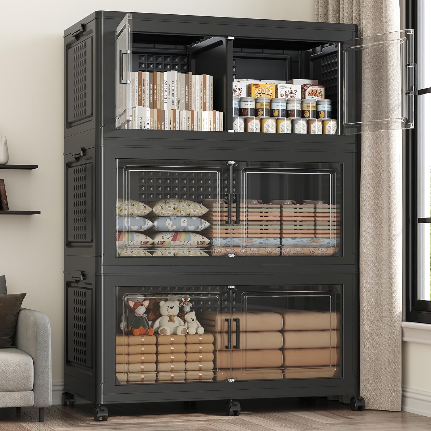 - 【Two Ways to Open & Clear Magnetic Doors】Fangtueh collapsible storage bins with lid and wheels feature a dual access way, allowing for both top and front door openings, and with clear windows for easy visibility. The stackable plastic storage bins with open front doors are equipped with magnetic lock buckles to prevent dust from entering the cabinet.