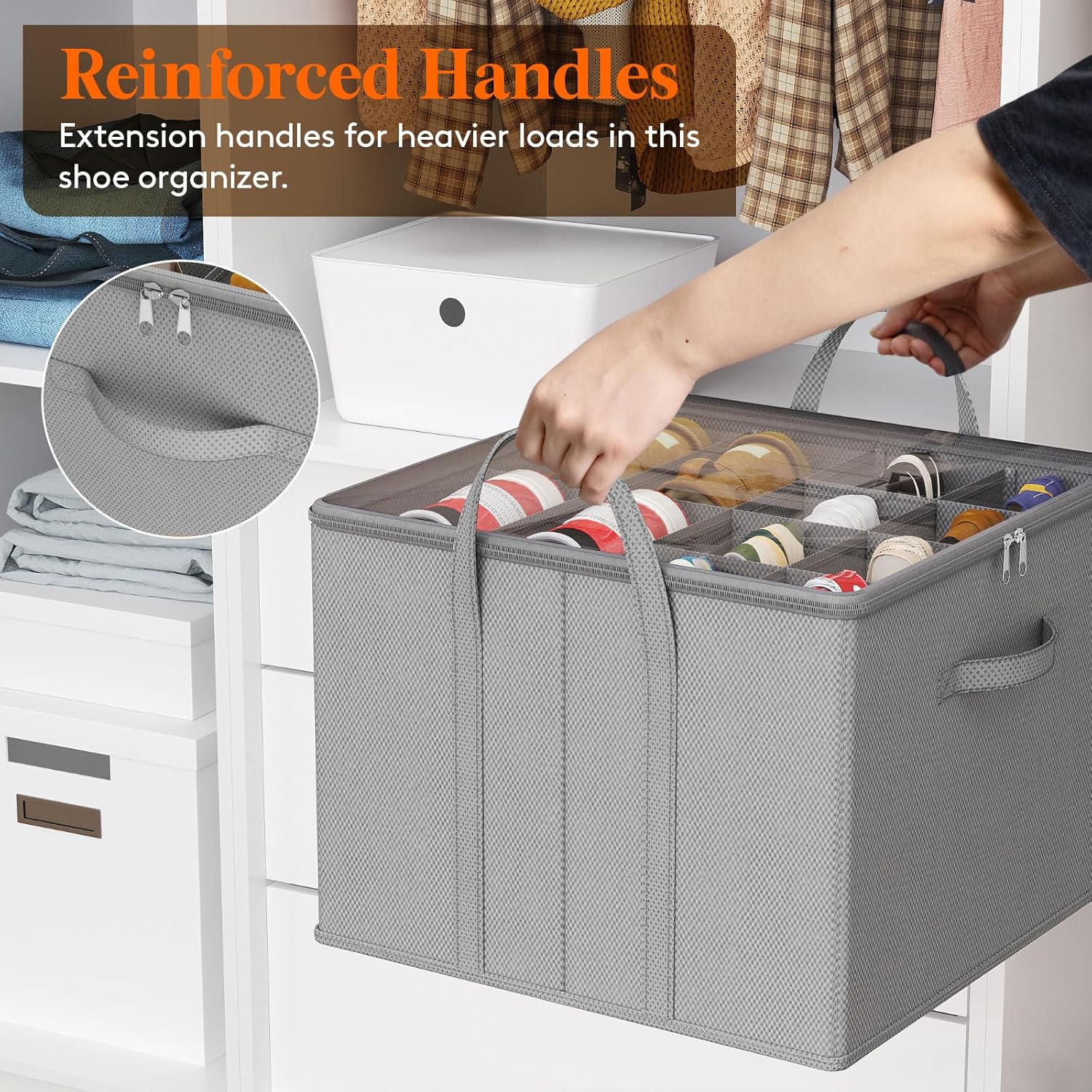 - Reinforced Structure: Crafted from non-woven fabric and reinforced cardboard, this shoe box features three sturdy handles for easy transport. Its robust side and bottom panels ensure shape retention under pressure, offering reliable long-term use