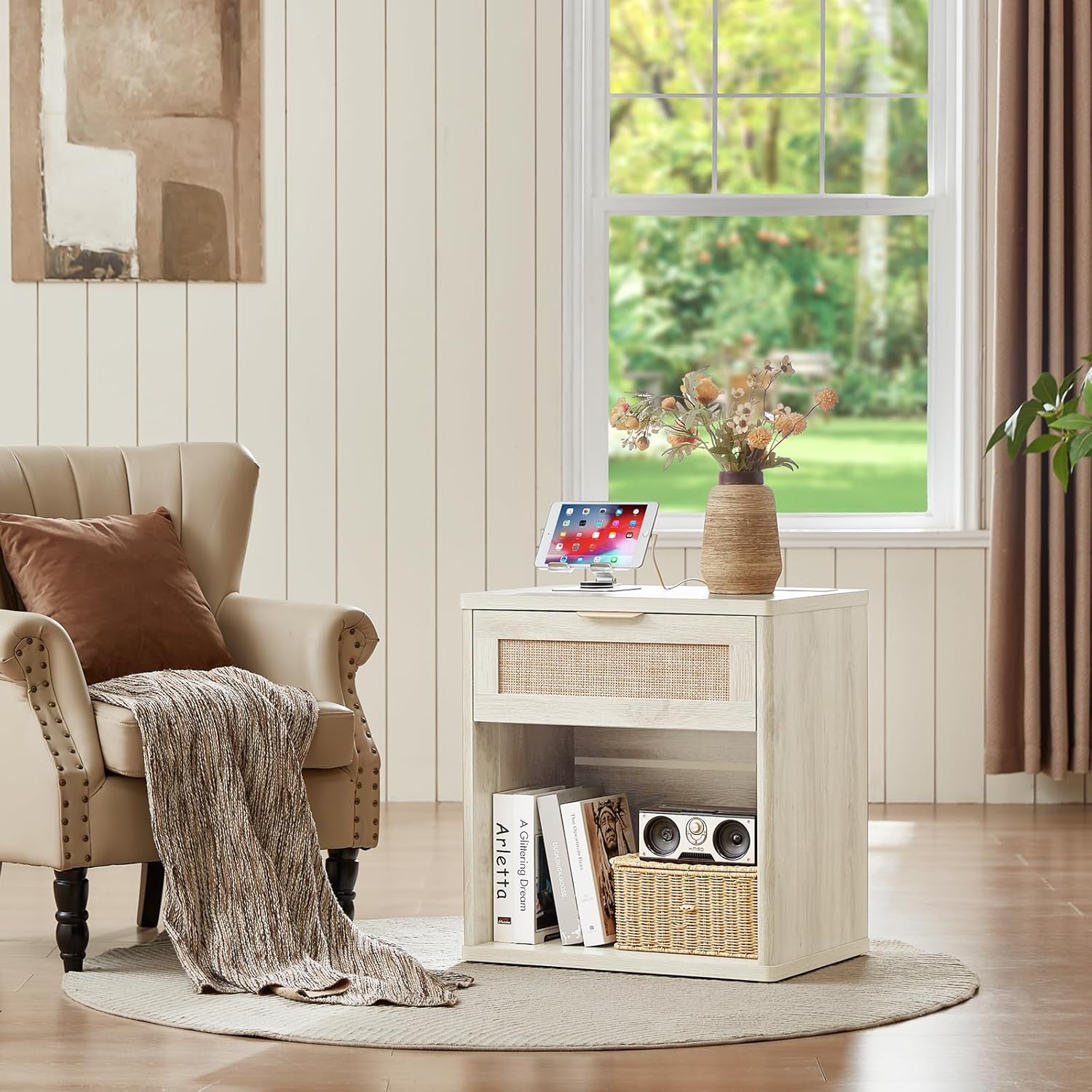 - Rattan Side Table:The nightstand cleverly blends boho and modern styles.It has unique rattan drawer and naturally textured surface highlights its artistic charm.Both beautiful and practical,the end tables bedroom comes in different color options and easily integrates into various of decorative styles, creating a warm home atmosphere.