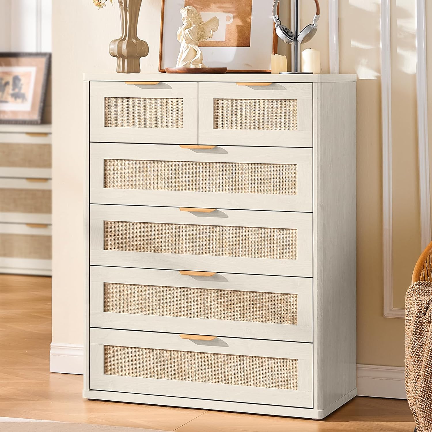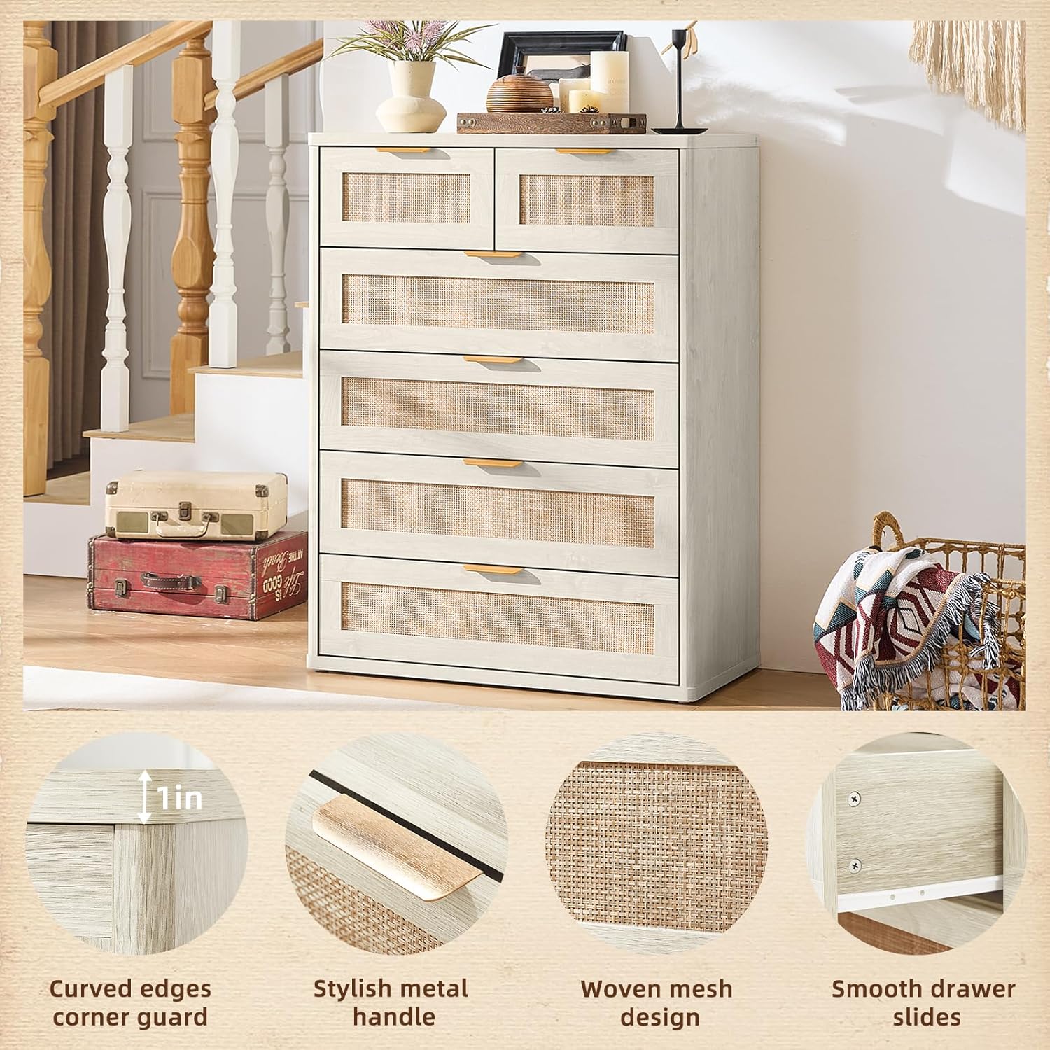 - Boho 6 Drawers Rattan Dresser for Bedroom : This 6 Drawer Wood Dresser flawless combines Boho and modern styles. The rattan-decorated drawers and natural wood grain enhance its visual appeal. This exquisite dresser for closet is available in multiple color options, easily blending into various decor styles to create a cozy home atmosphere.