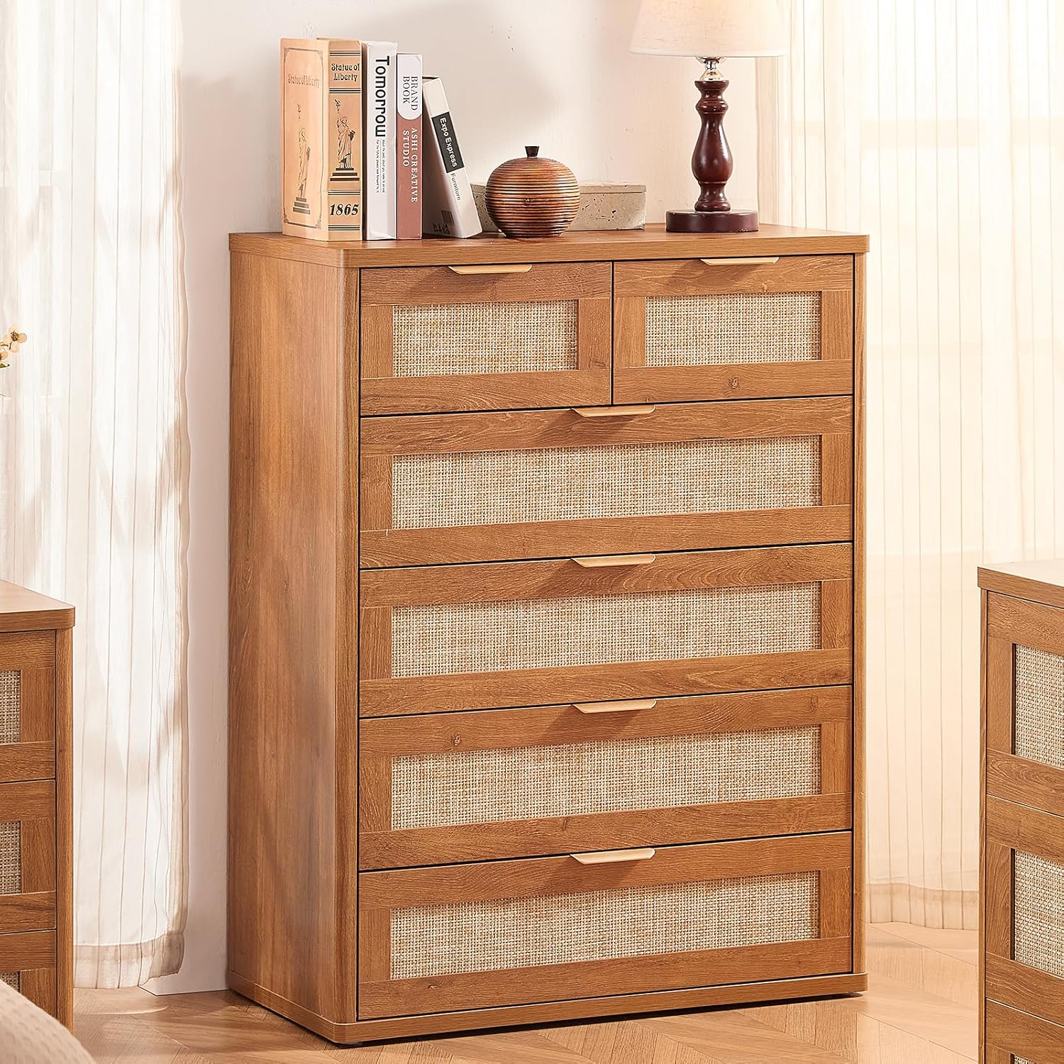 - Boho 6 Drawers Rattan Dresser for Bedroom : This 6 Drawer Wood Dresser flawless combines Boho and modern styles. The rattan-decorated drawers and natural wood grain enhance its visual appeal. This exquisite dresser for closet is available in multiple color options, easily blending into various decor styles to create a cozy home atmosphere.