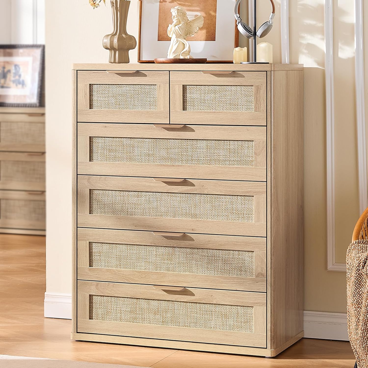 - Boho 6 Drawers Rattan Dresser for Bedroom : This 6 Drawer Wood Dresser flawless combines Boho and modern styles. The rattan-decorated drawers and natural wood grain enhance its visual appeal. This exquisite dresser for closet is available in multiple color options, easily blending into various decor styles to create a cozy home atmosphere.