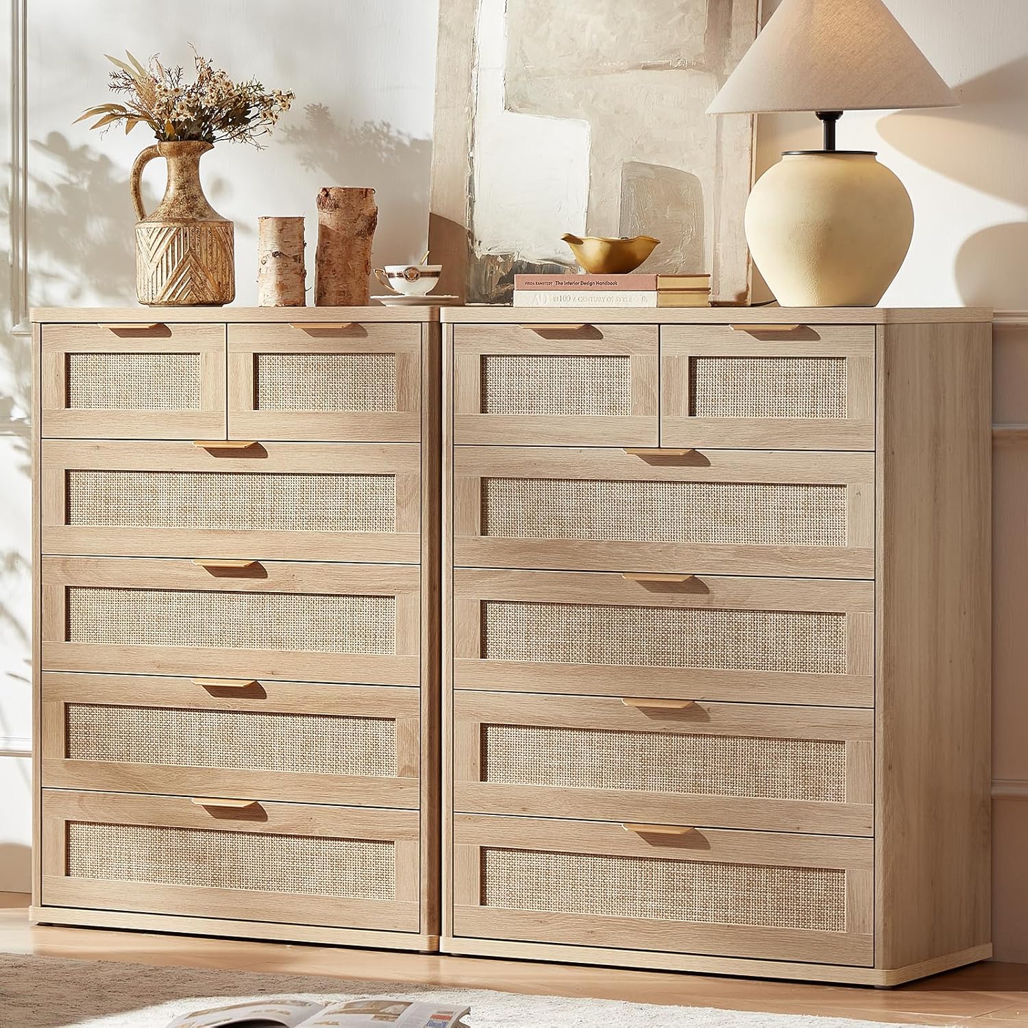 LEYAOYAO Rattan Dresser for Bedroom Set of 2, 42" Tall Chest of Drawers, Modern 6 Drawers Boho Dressers with Storage, Light Oak Dresser Wooden Closet Organizer for Living Room, Hallway, Natural Wood