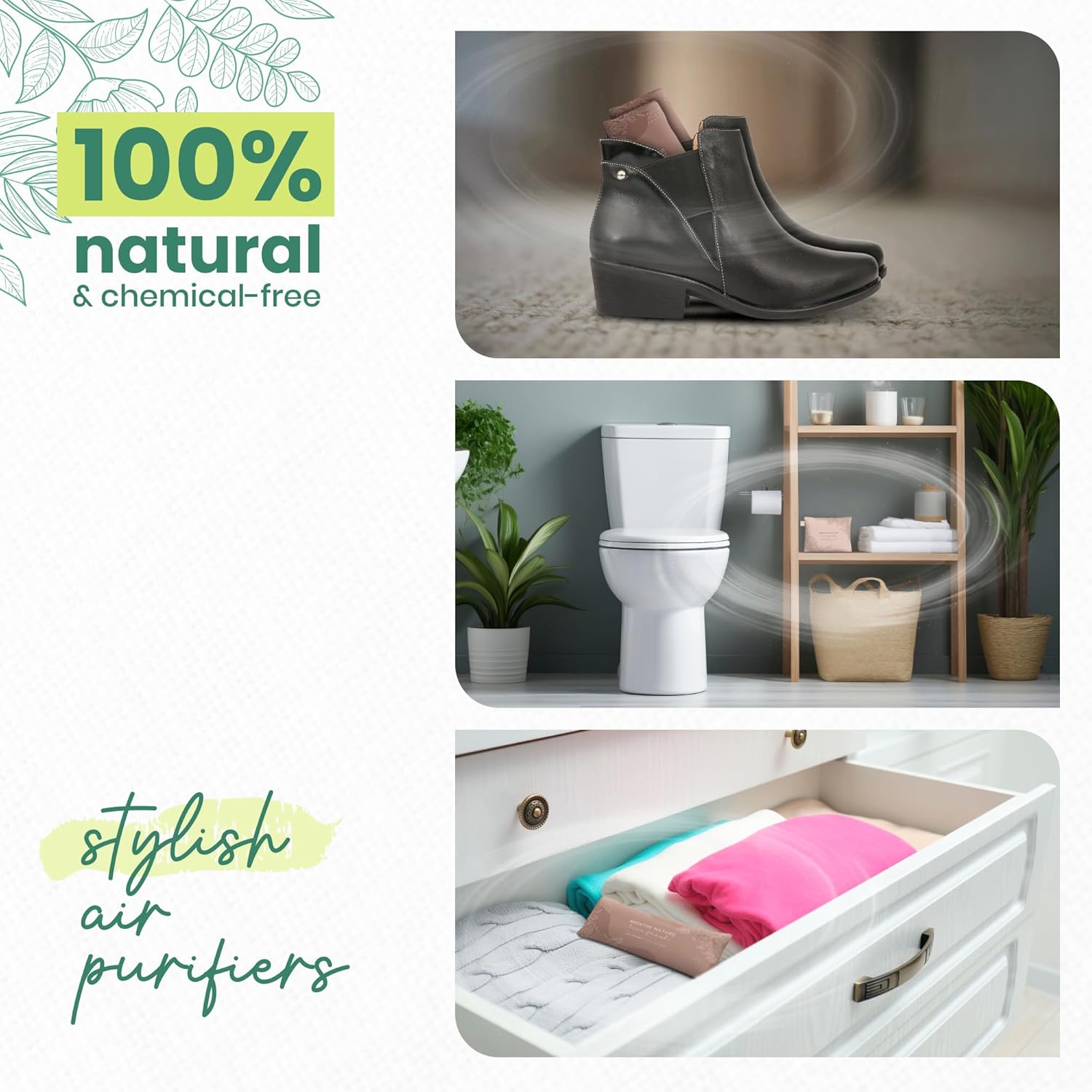 - NATURAL ODOR ABSORPTION TECHNOLOGY: – Harness the power of bamboo charcoal bags to naturally purify your living spaces. This advanced odor absorber targets moisture and bad smells at the source—perfect for closets, cars, bathrooms, shoe racks, cat litter boxes, cabinets, and even the basement.