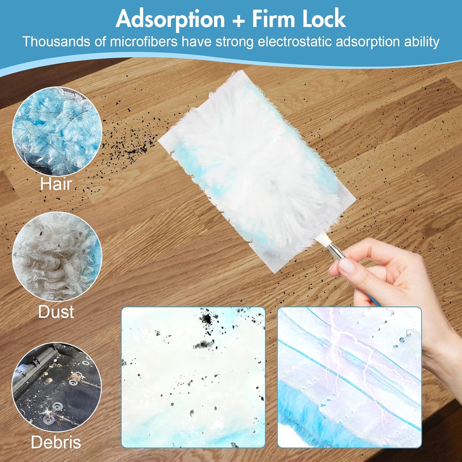 - 【4x Strong Electrostatic Adsorption】 Before using the for swiffer dusters refill, shake the microfiber feathers evenly. They are made up of thousands of soft, dense fibers, giving the fiber surface strong electrostatic attraction under a fluffy texture. Additionally, a special coating is applied to enhance the static electricity, enabling efficient adhesion and capture of fine dust, debris, pet hair, and other particles on various surfaces, securely locking them in place.