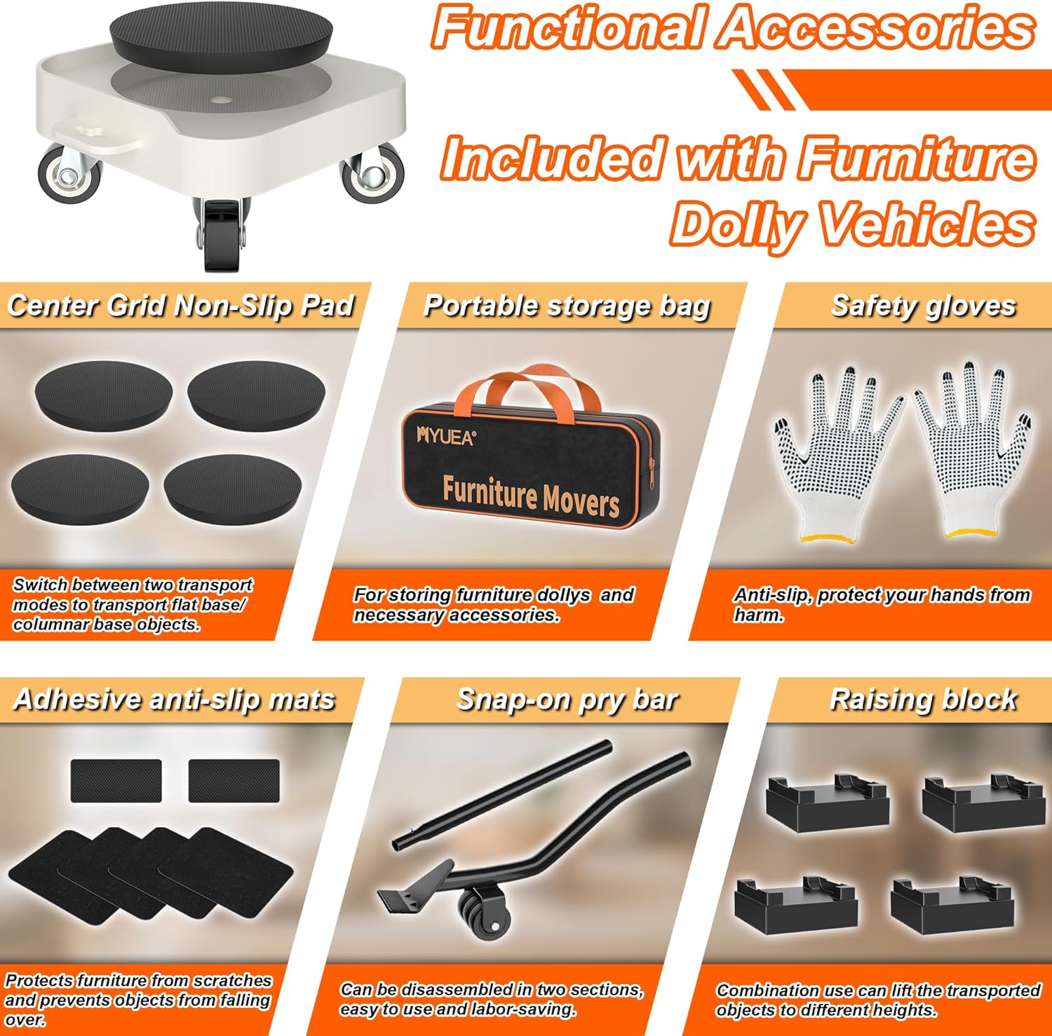 - Complete Furniture Dollies Kit (Saves Time & Effort):Includes pry bar (for lifting),anti-slip gloves,lift pads,and storage bag.Move heavy furniture solo—50% less effort vs. manual lifting.