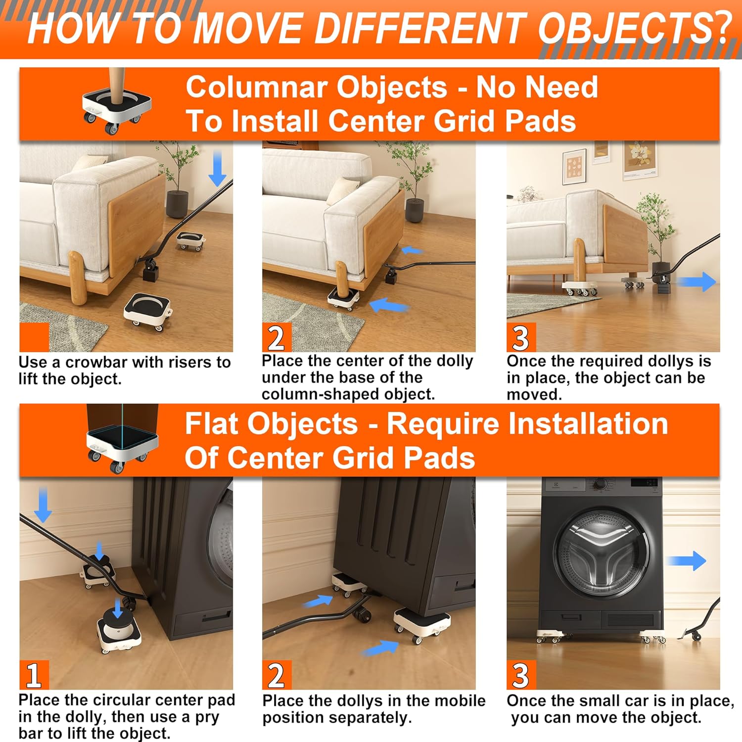 - Dual-Mode Lifting System:Remove the center pad to move round-leg furniture (e.g., chairs, tables). Insert the pad for flat-base items (e.g., cabinets, refrigerators). One furniture dolly, two uses.