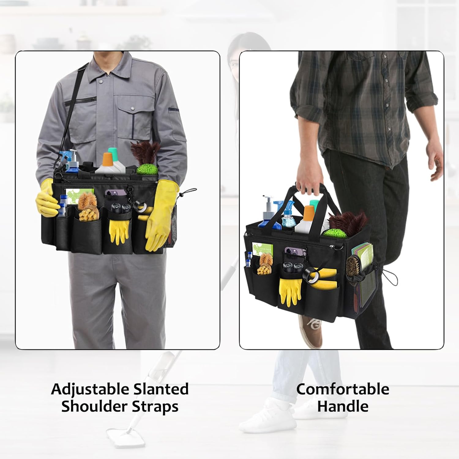- Comfortable and Easy to Wear: This caddy organizer with handle comes with a padded shoulder strap and a waist belt for comfortable wear. You can sling it over your shoulder or pick it up with the side carry handle, easy to carry, easy to get in and out of your home or car. Free your hands and carry your cleaning supplies with ease. Our cleaning organiser is a good helper for you to clean and keep everything you need at your fingertips