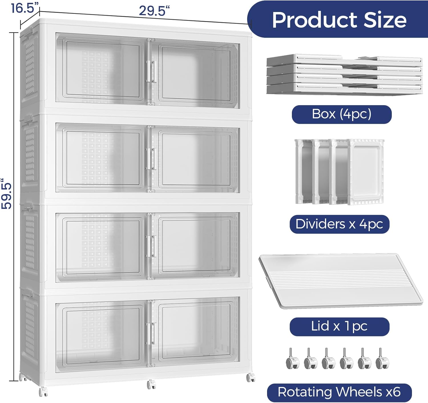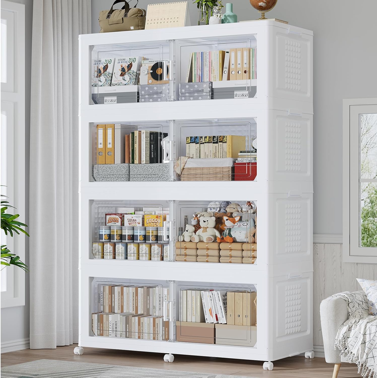 - 【Two Ways to Open & Clear Magnetic Door】The collapsible storage bins with lids and wheels feature a dual access way, allowing for both top and front door openings, and with clear windows for easy visibility. The stackable plastic storage bins with open front doors are equipped with magnetic lock buckles to prevent dust from entering the cabinet.