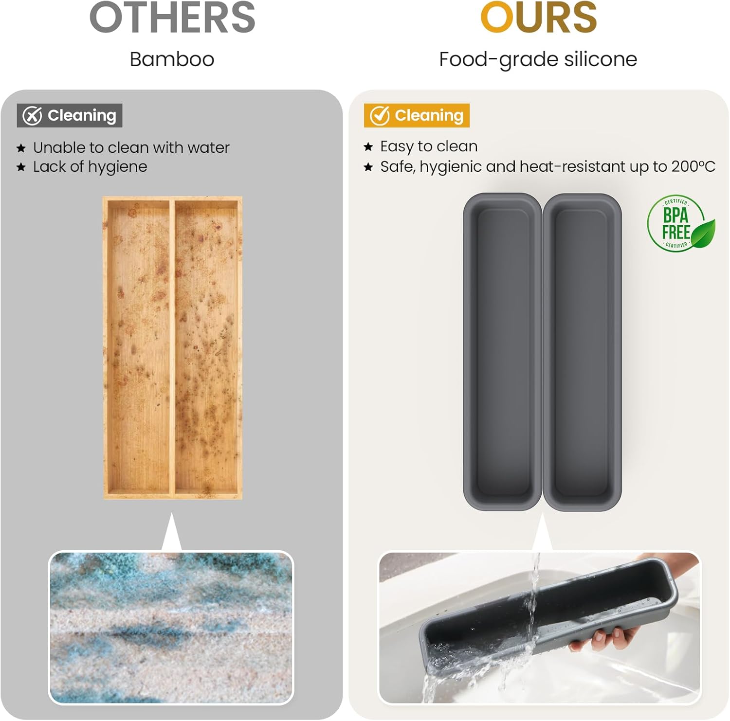 - High-quality Silicone Material: This Cutlery drawer organizer made of food-grade silicone material, it is safe and non-toxic, resistant to high temperatures up to 200°C and can be sterilized by steam. It does not deform, whether for cleaning or storage, it remains hygienic and durable. Meanwhile, the soft material will not scratch your tableware and protect their luster