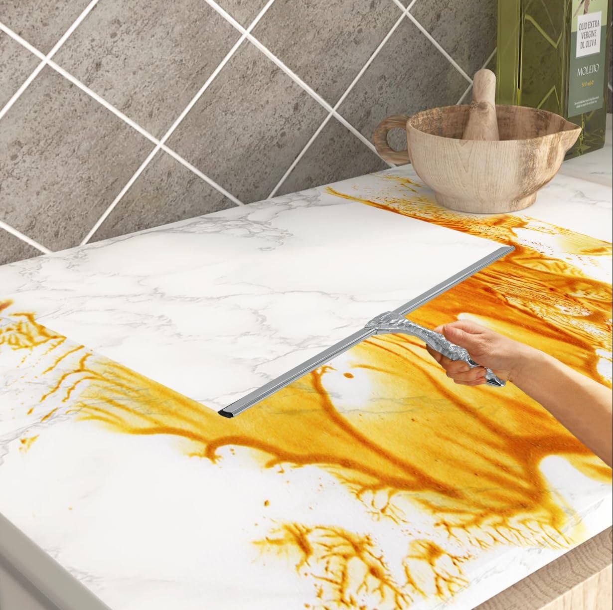 - Powerful 10-Inch Stainless Steel Squeegee The durable silver stainless steel frame and soft silicone blade effortlessly clear water and soap scum from your shower glass doors, tiles, and walls in seconds. Resists rust and leaves a perfect streak-free shine every time.
