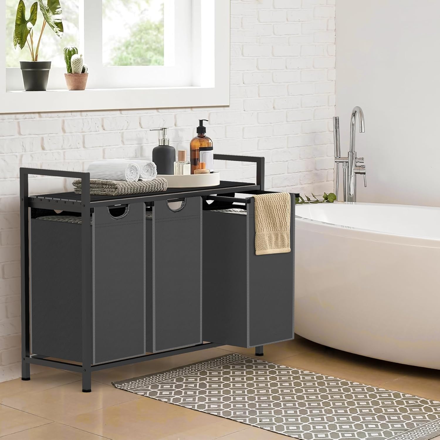 Laundry Hamper, Laundry Sorter with 3 Pull-Out Removable Oxford Fabric Bags Cloth Laundry Basket 3 x 10 Gallons (Grey and Charcoal Black)