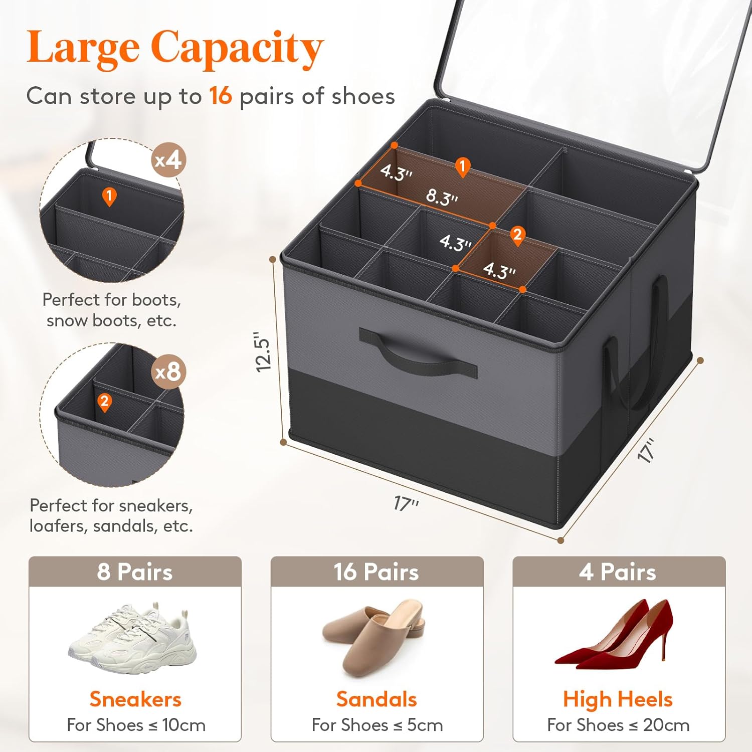 Lifewit Shoe Storage Organizer for Closet Fits 12-16 Pairs, Fabric Large Shoe Box Storage Containers with Clear Cover, Foldable Bins Fit for Boots Sneakers 17"(L) x 17"(W) x 12.5"(H) Gray and Black