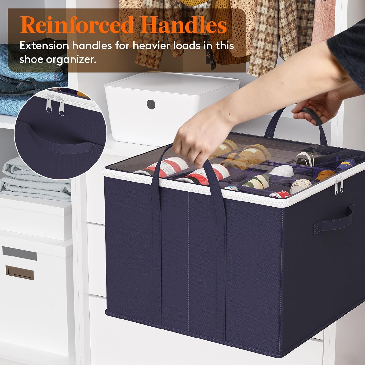- Reinforced Structure: Crafted from non-woven fabric and reinforced cardboard, this shoe box features three sturdy handles for easy transport. Its robust side and bottom panels ensure shape retention under pressure, offering reliable long-term use