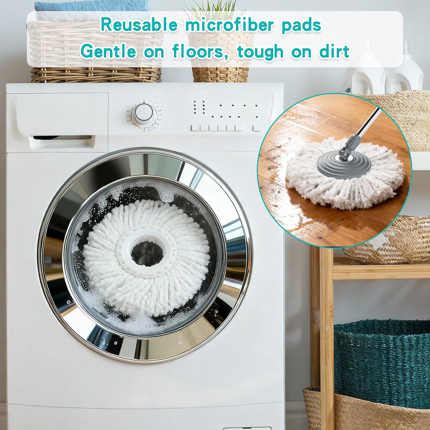 - Durable Spin Mop with Microfiber Mop Heads & 4-Chamber Separation-Built for durability, the system includes 6 washable microfiber mop heads for multi-surface use. The patented 4-chamber design keeps clean and dirty water fully separated, ensuring a truly hygienic clean from start to finish.
