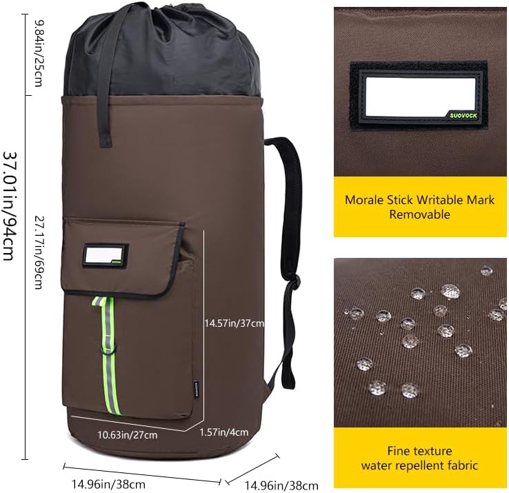 - [Large capacity & multi-pocket design】The laundry bag backpack measures 37.5 ''H*15.5 ''L and weighs 17.3oz. The top of the backpack is retractable and can be expanded up to 38" high. With a maximum capacity of 115 liters, it is larger than the average backpack. With a 11.75 "H*11 "L*2 " front pocket, it can hold laundry detergent, underwear, socks, laundry cards, and other accessories. The multi-pocket design makes it easier to find items by sorting them