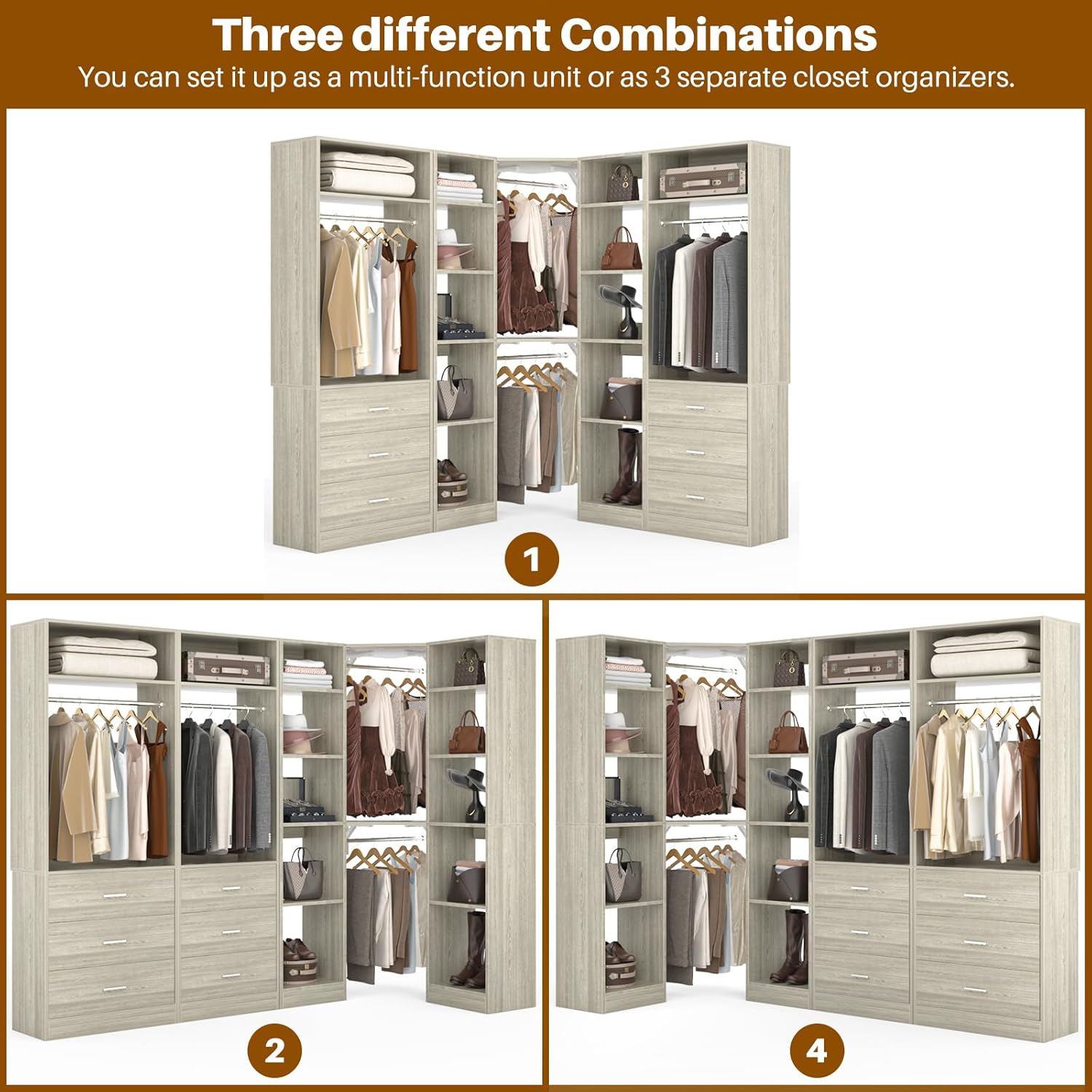 Corner Closet System with 6 Drawers, Closet Organizer System with 14 Shelves & 4 Hanging Rods, 87.2"L * 39.2"W / 63.2"L * 63.2"W Reversible L Shaped Walk-in Closets, Load 2500+LBS, White Oak