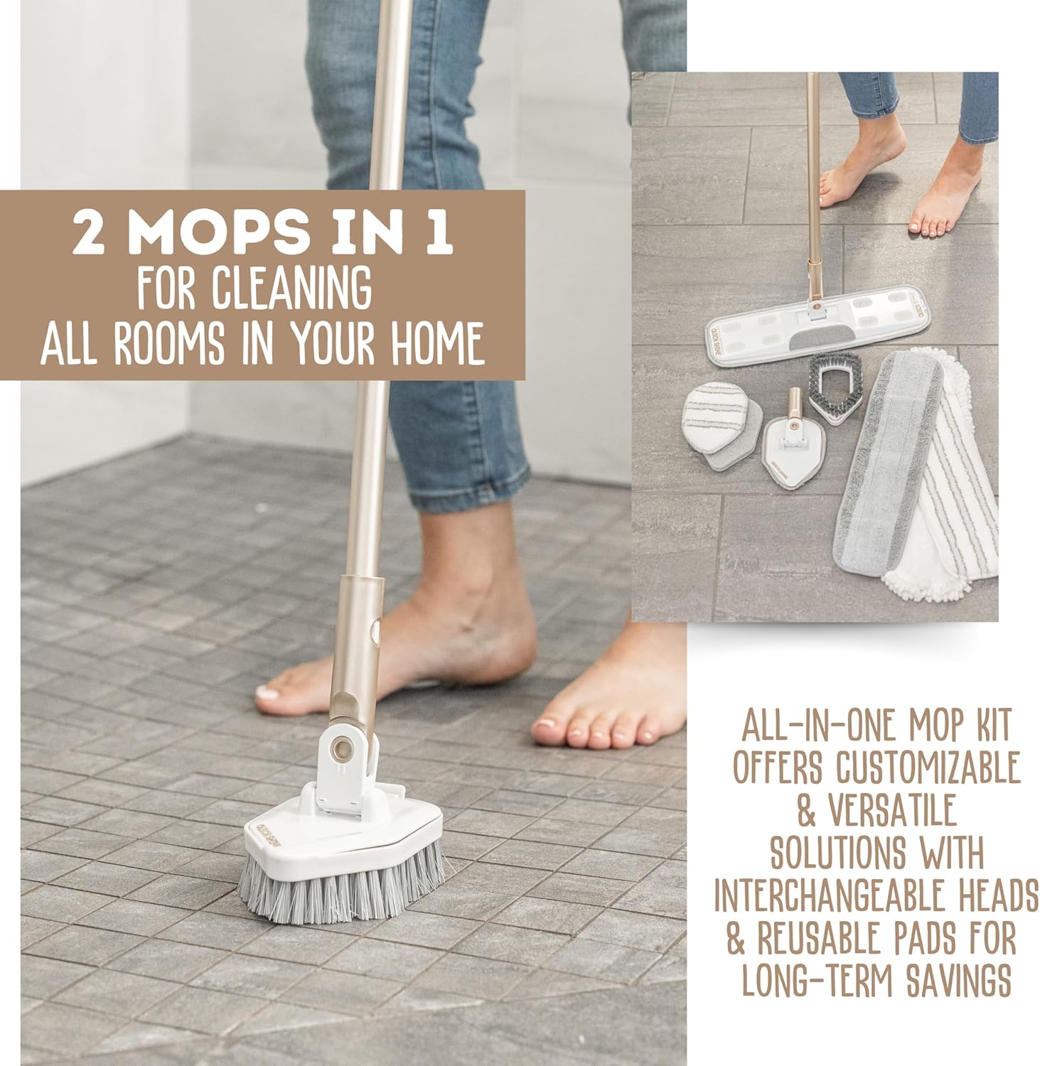 - Complete Floor Cleaning System: What’s Included – Mop with Extra Wide Mop Head with Scouring Pad, Microfiber Multi-Action Wet + Dry Cleaning Pad, Microfiber Multi-Action Clean + Dust Pad, Microfiber Multi-Action Clean + Polish Pad, Interchangeable Triangular Mop Head, Triangular Multi-Action Scrub Brush, Triangular Multi-Action Cleaning Pad, Triangular Multi-Action Scouring Pad, Cleaning Spade and 16oz Quick Shine Hardwood Floor Luster