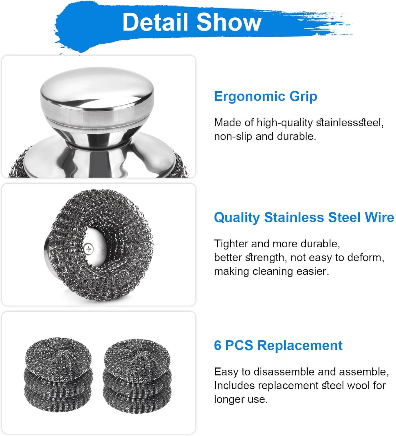 - 【Ergonomic Design】Steel Wool Scrubber With Ergonomic Stainless Steel Handle, Easily Hold and Effortless Cleaning, Avoiding Your Hands Directly in Contact With grease, Stains and Detergents, Stainless Steel Scrubber Will Cleaning Efficiency and Protect Your Hands.