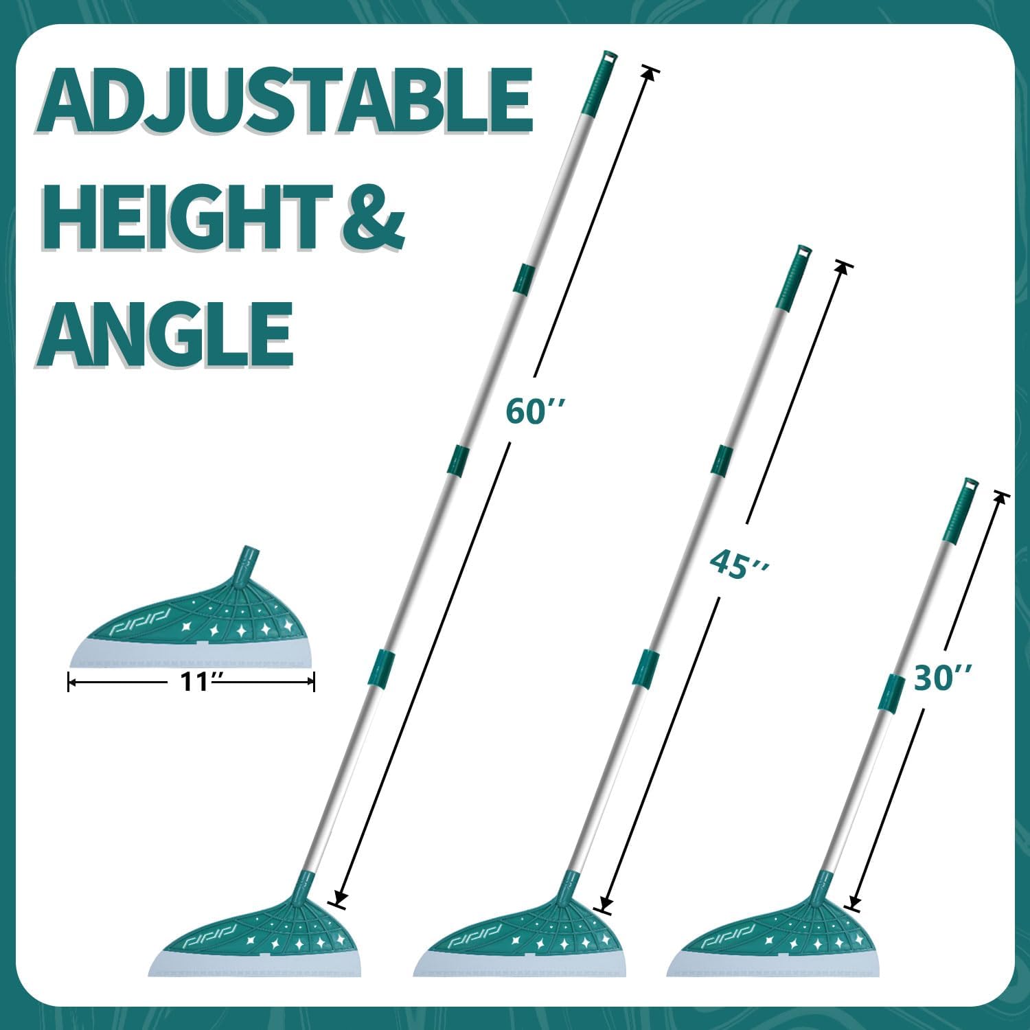 - Adjustable Length: According to usage needs, the pole length can be adjusted to 30’’-45’’-60’’. Different lengths can handle cleaning floors, wiping car windows, and dealing with countertop debris. The aerospace-grade aluminum material adopts a thickened design for more stability and durability
