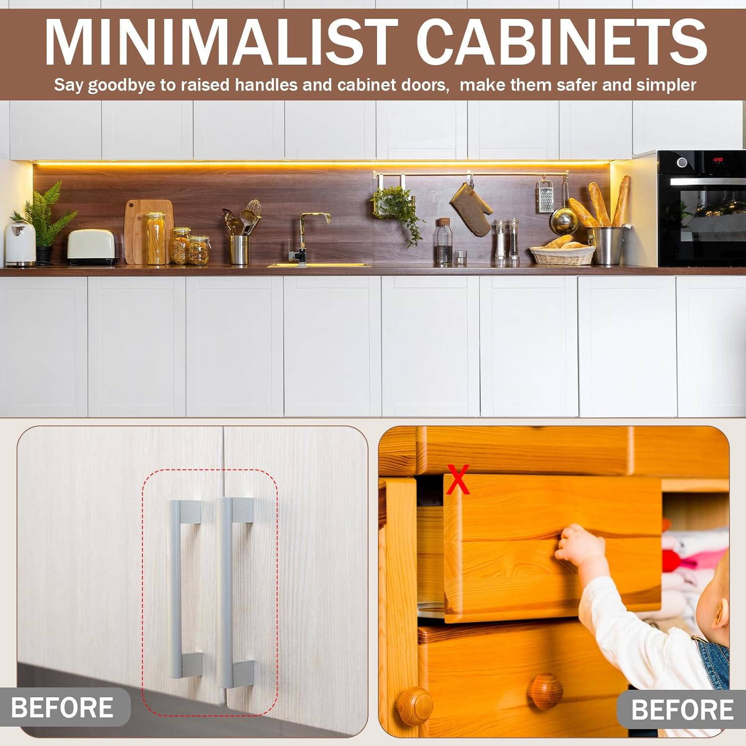 - Magnetic Hold: powerful built in magnet ensures doors and drawers stay securely closed, no more accidental openings from vibrations, bumps, or pets; Works reliably with lightweight to medium weight doors (wood, mdf, laminate) and drawers, even when filled with dishes, tools, or clothing