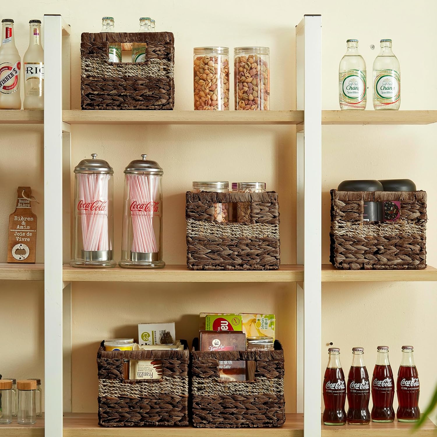 - Chic Basket Design: With natural materials design, this water hyacinth and seagrass basket with built-in handles complements any home decor style. Shelf baskets' earthy tones and organic texture add a touch of warmth and charm to your living space, while its practical shape make it a functional addition to any room.