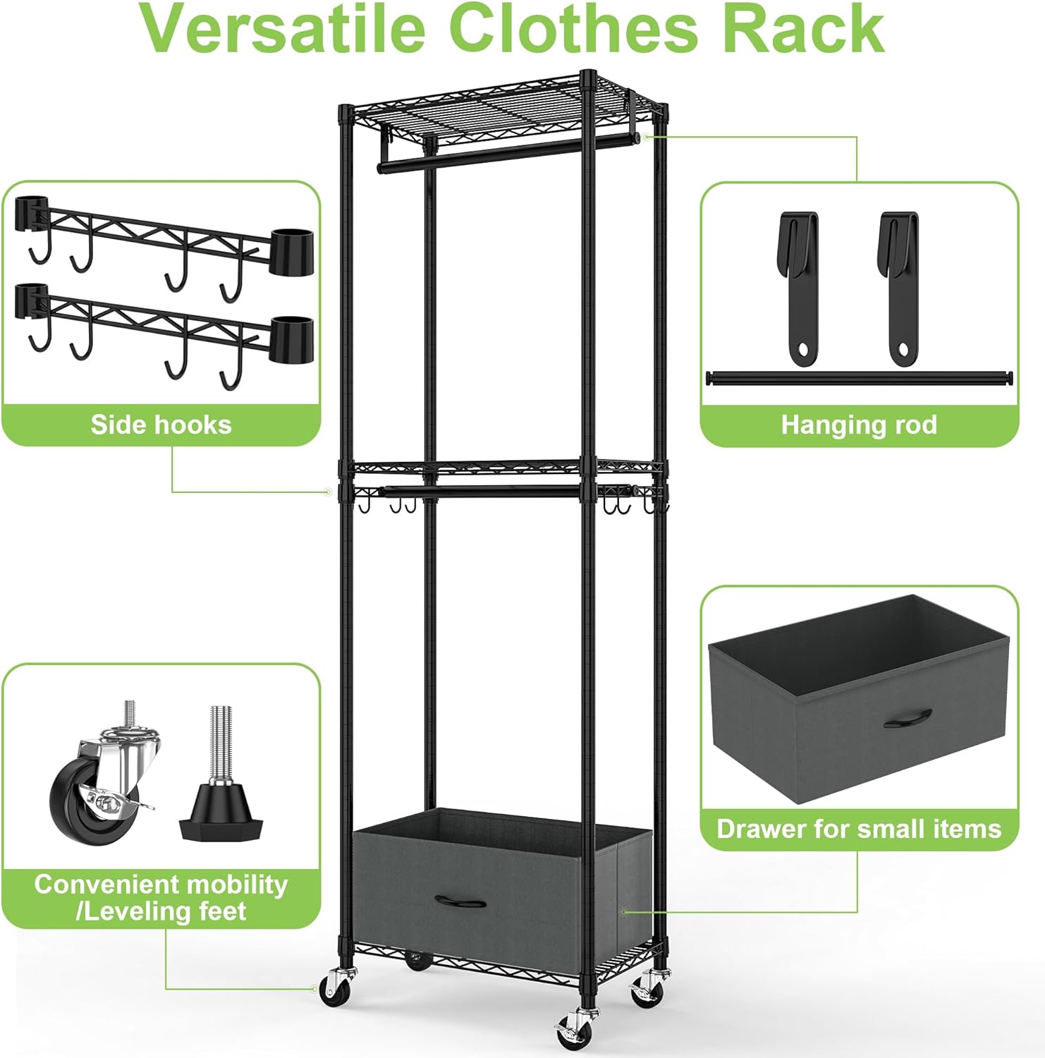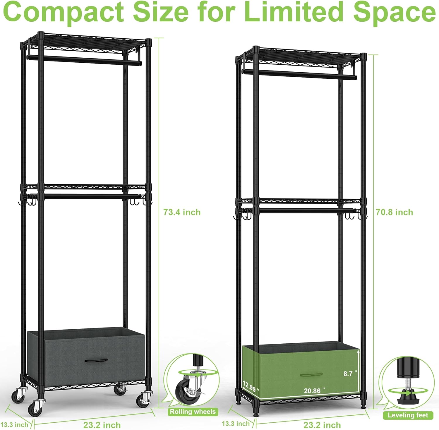 - Compact Size & Versatile Storage: Clothes Rack with Drawers measures 23.2 x 13.3 x 73.4 inches (with wheels) and features three shelves, two rods, one drawer, and two side hooks. It's perfect for organizing shirts, jackets, pants, underwear, boots/shoes, bags, luggage, and more without taking up too much space.