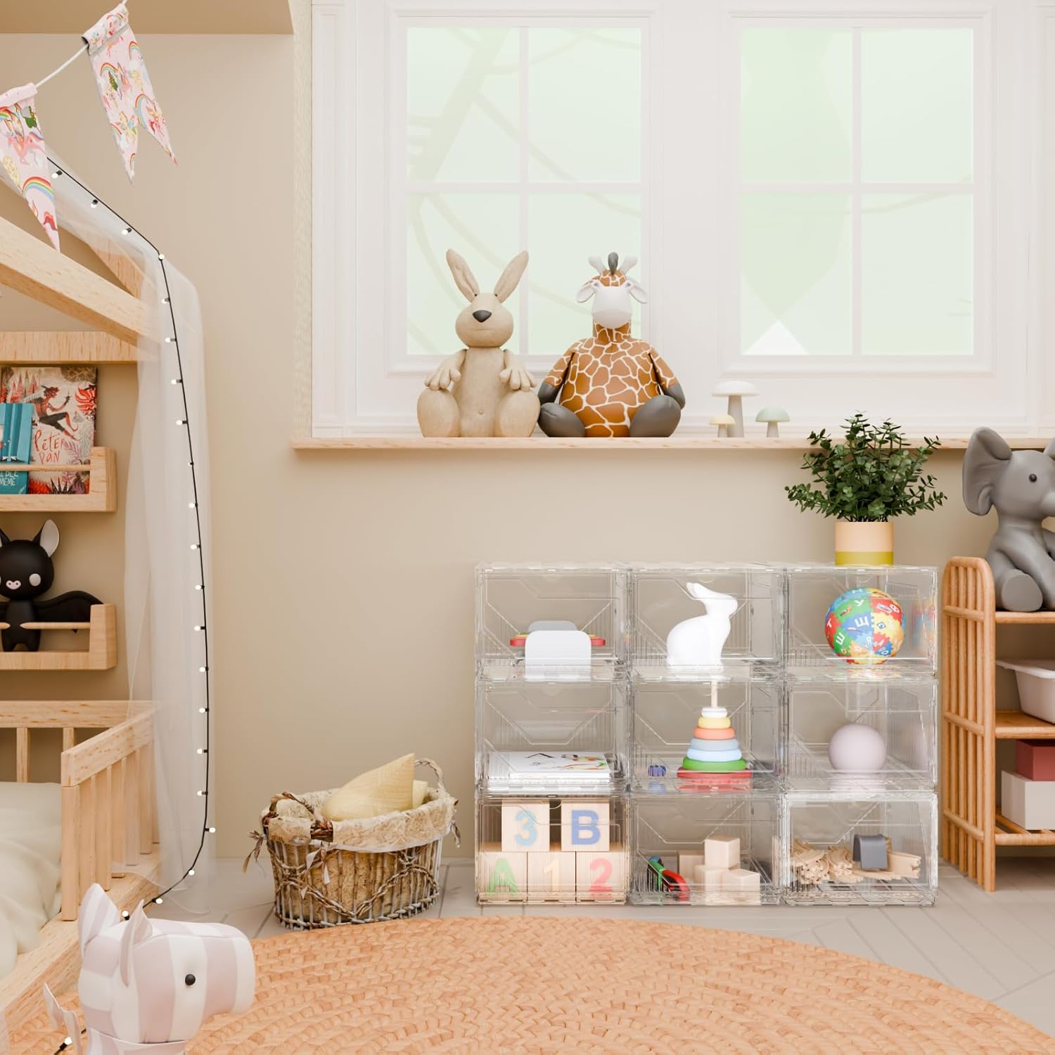- Widely Applicable: Suitable for storing clothes, scarves, duckbill hats, fisherman hats, berets, towels, bath towels, small bags, etc. It can also be used to store bathroom products such as shower gel, hand sanitizer, aromatherapy candles, tissues, etc. This kitchen organizer can also accommodate kitchen supplies such as spice jars, garbage bags, cans, bagged coffee beans, etc It can also store toys like remote control vehicles, building blocks, train set and handmade tools, and DIY products like yarn skeins. Find right things through clear front door with a glimpse.