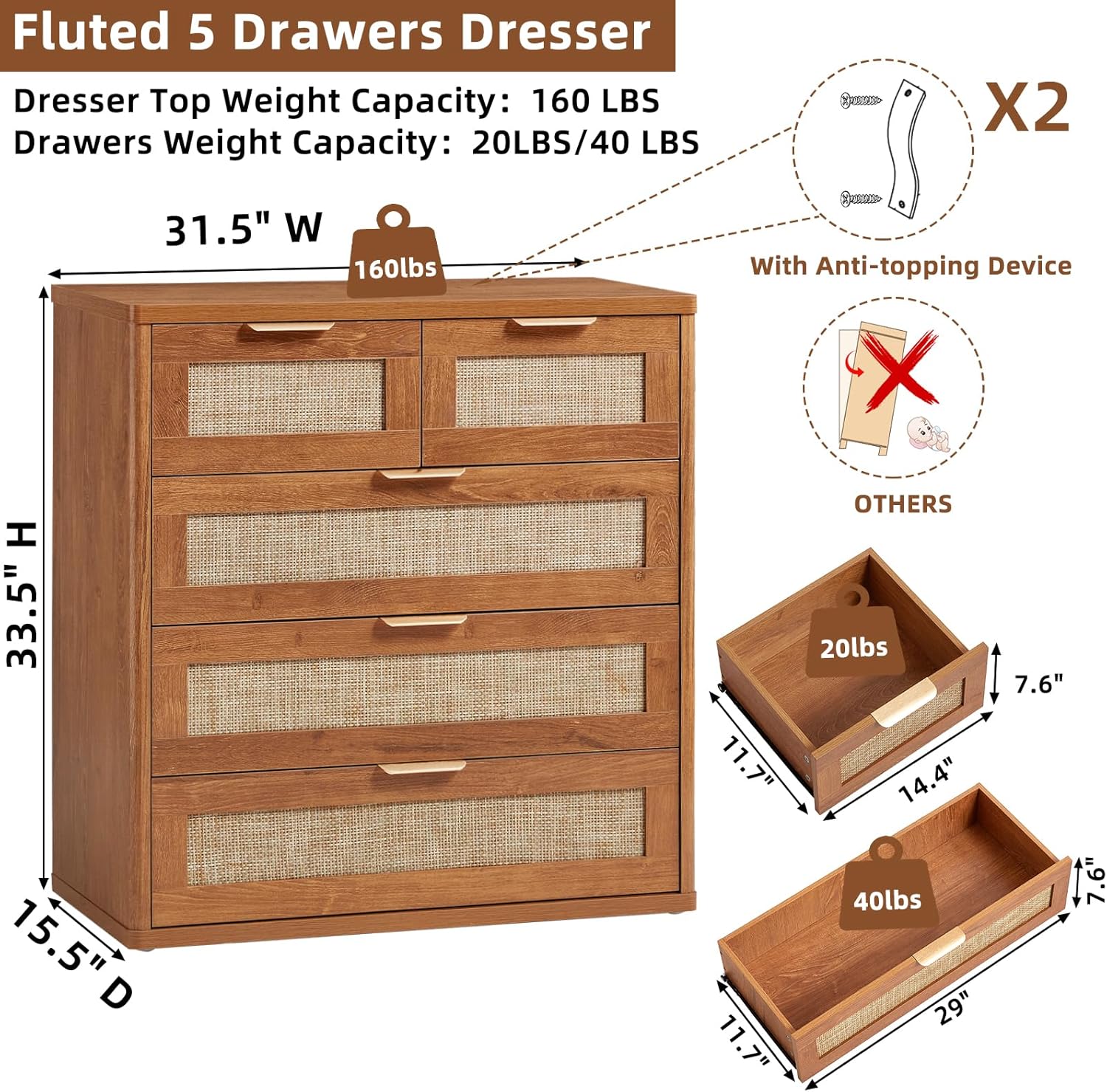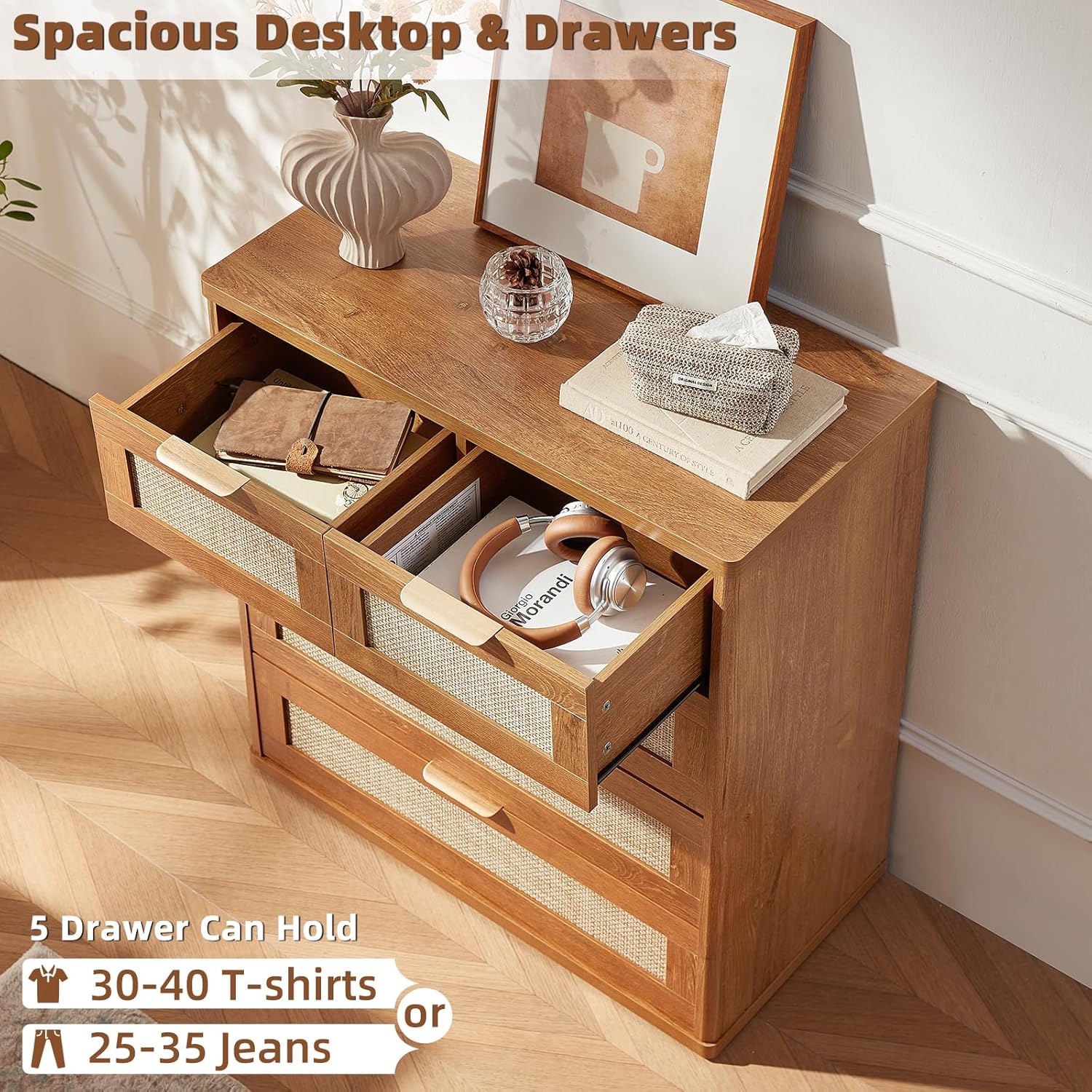 - Boho 5 Drawers Rattan Dresser for Bedroom : This 5 Drawer Wood Dresser flawless combines Boho and modern styles. The rattan-decorated drawers and natural wood grain enhance its visual appeal. This exquisite dresser for closet is available in multiple color options, easily blending into various decor styles to create a cozy home atmosphere.