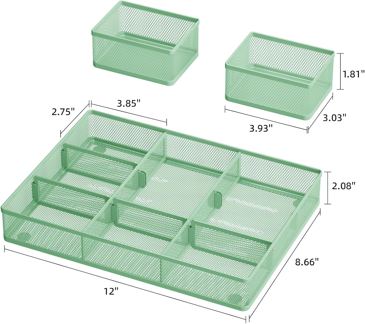 Marbrasse 3 Packs Desk Drawer Organizers, Metal Mesh Dividers with 9 Adjustable Compartments, Pen Organizer for Drawer Tray Box Accessories for Desktop,Kitchen, Makeup(Green)
