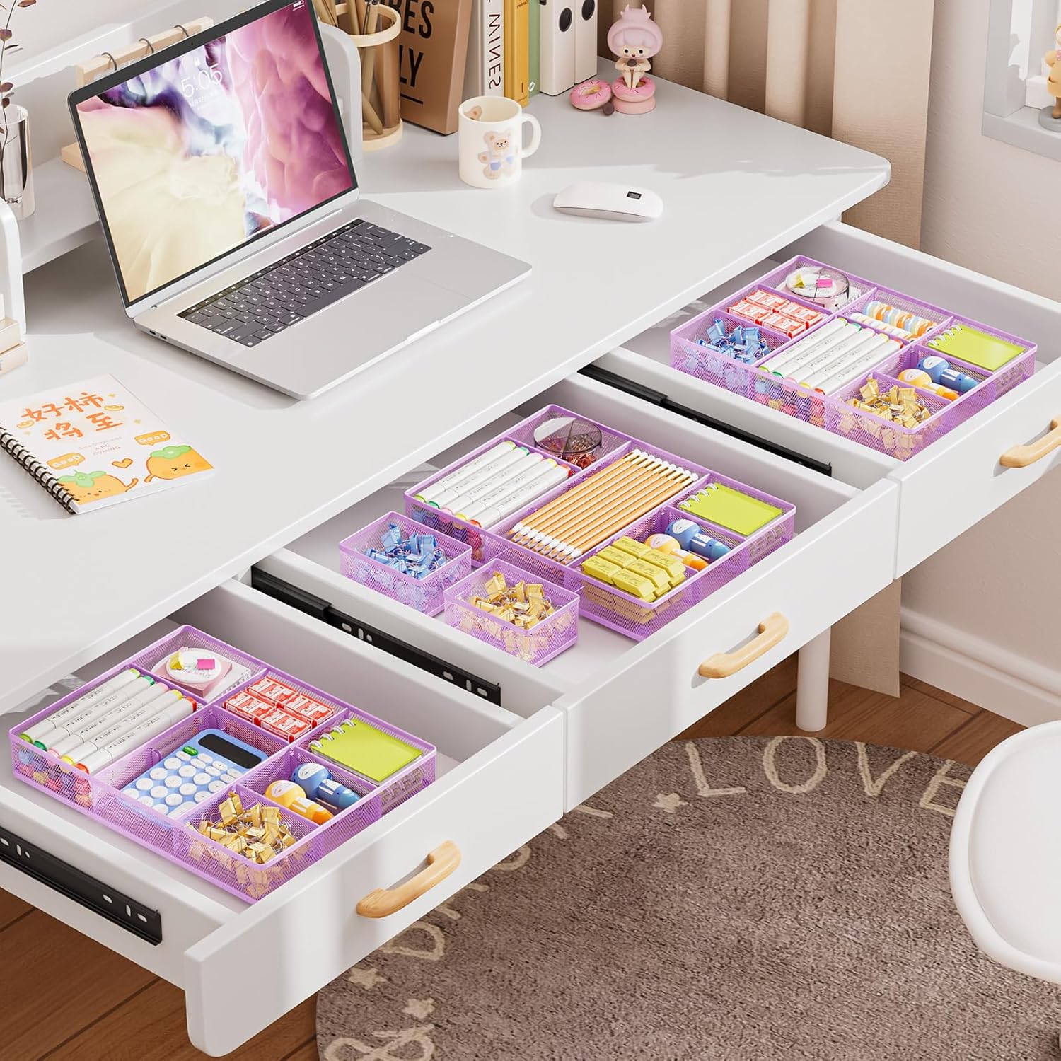 Marbrasse 3 Packs Desk Drawer Organizers, Metal Mesh Dividers with 9 Adjustable Compartments, Pen Organizer for Drawer Tray Box Accessories for Desktop,Kitchen, Makeup(Purple)