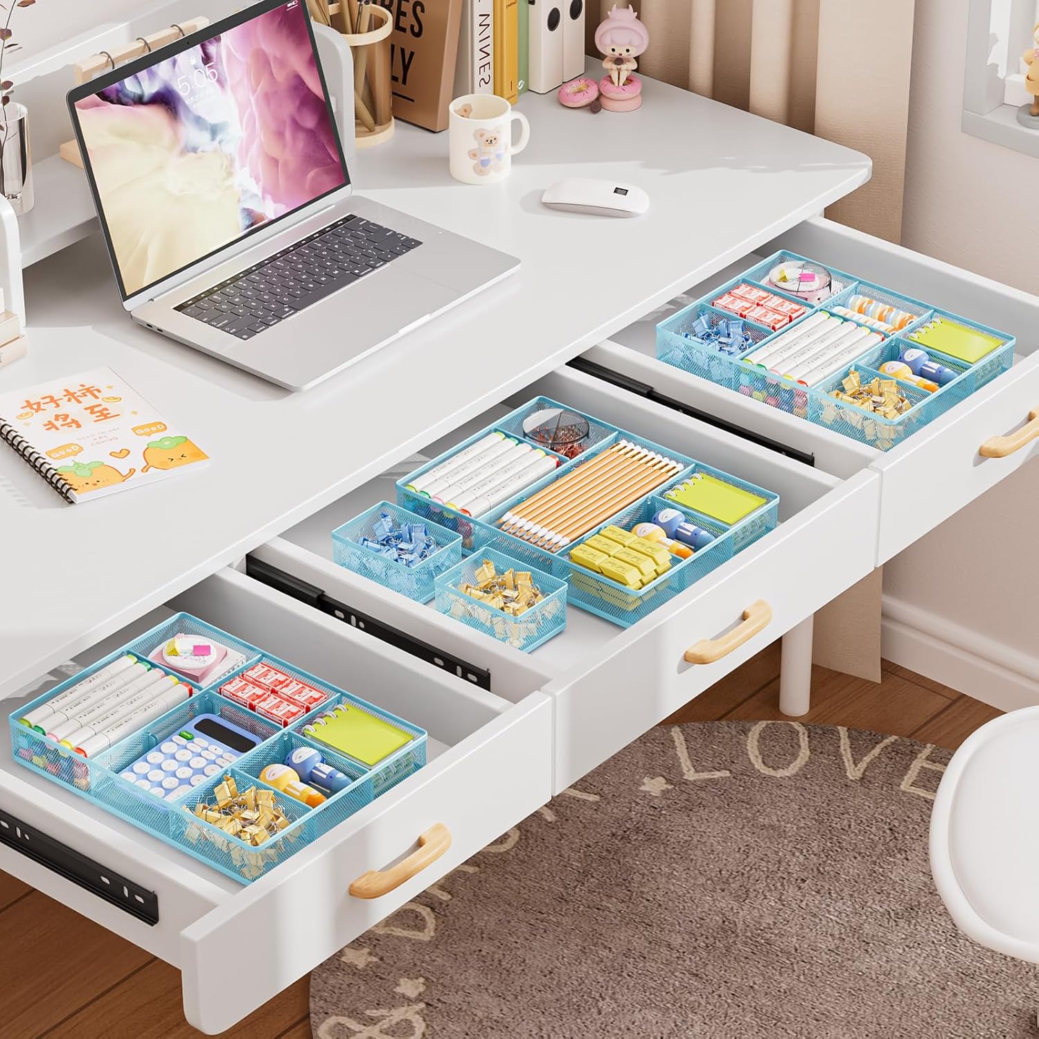 Marbrasse 3 Packs Desk Drawer Organizers, Metal Mesh Dividers with 9 Adjustable Compartments, Pen Organizer for Drawer Tray Box Accessories for Desktop,Kitchen, Makeup(Blue)