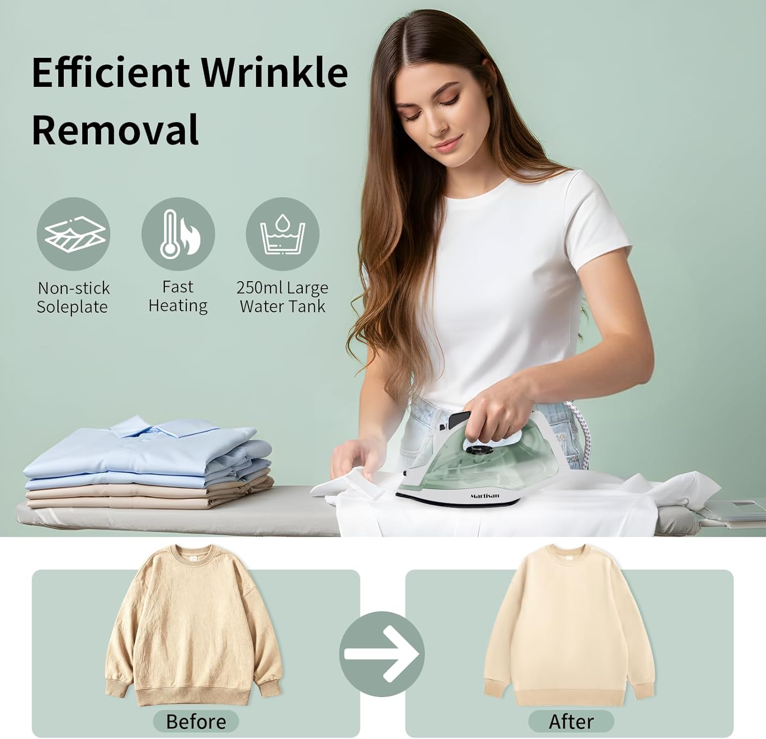 Martisan 2000W Powerful Steamer, Steam Iron for Clothes, Non-stick Soleplate, 4-in-1 Iron, Anti Drip, Fast Heating, Adjustable Temperature, Spray & Burst Steam, Green