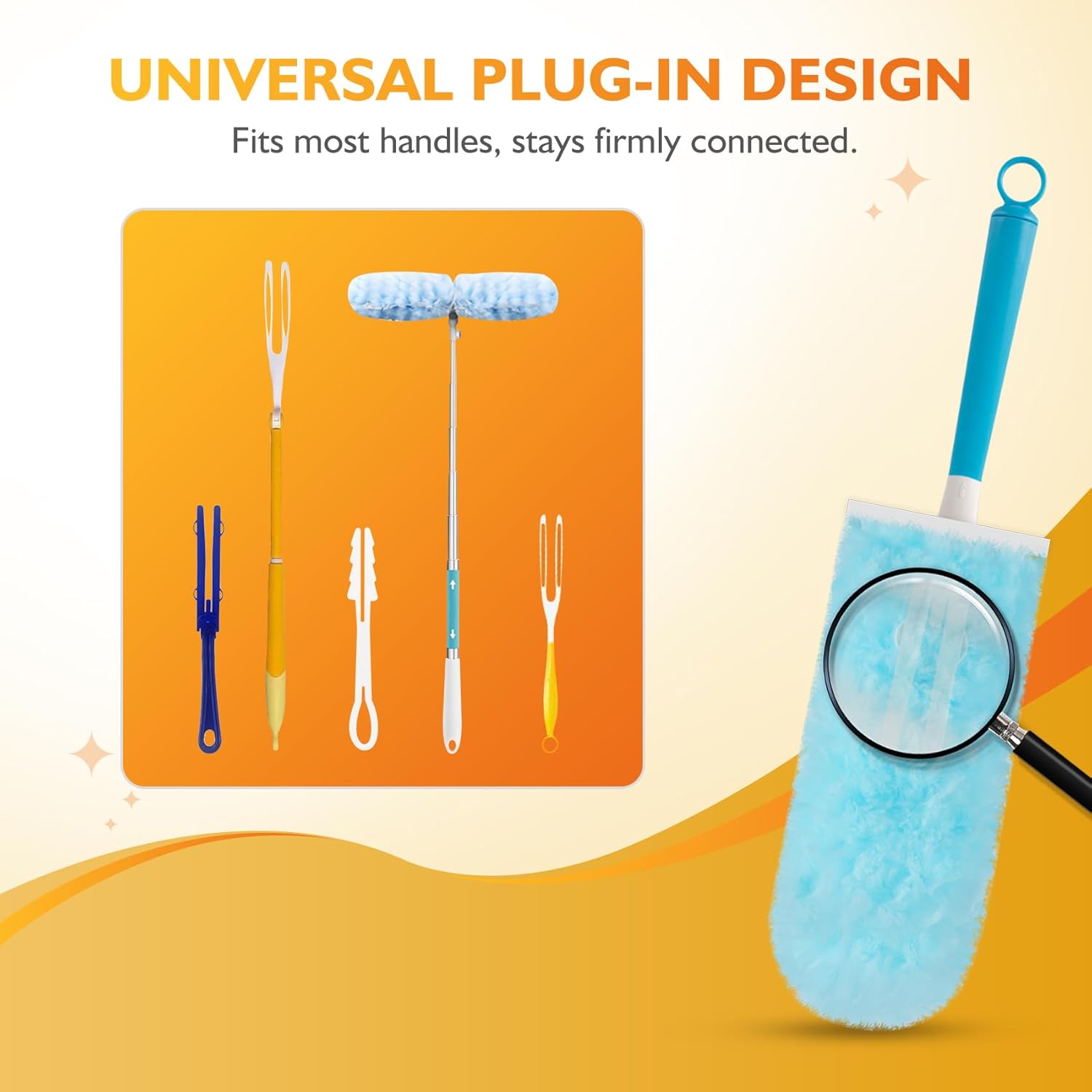 - COMPATIBLE: The microfiber duster with extension pole features a universal plug-in design for hassle-free use and is compatible with most brands of duster handles. The 360° duster refills also work perfectly with different handles, such as duster extendable handle, rotary handle.
