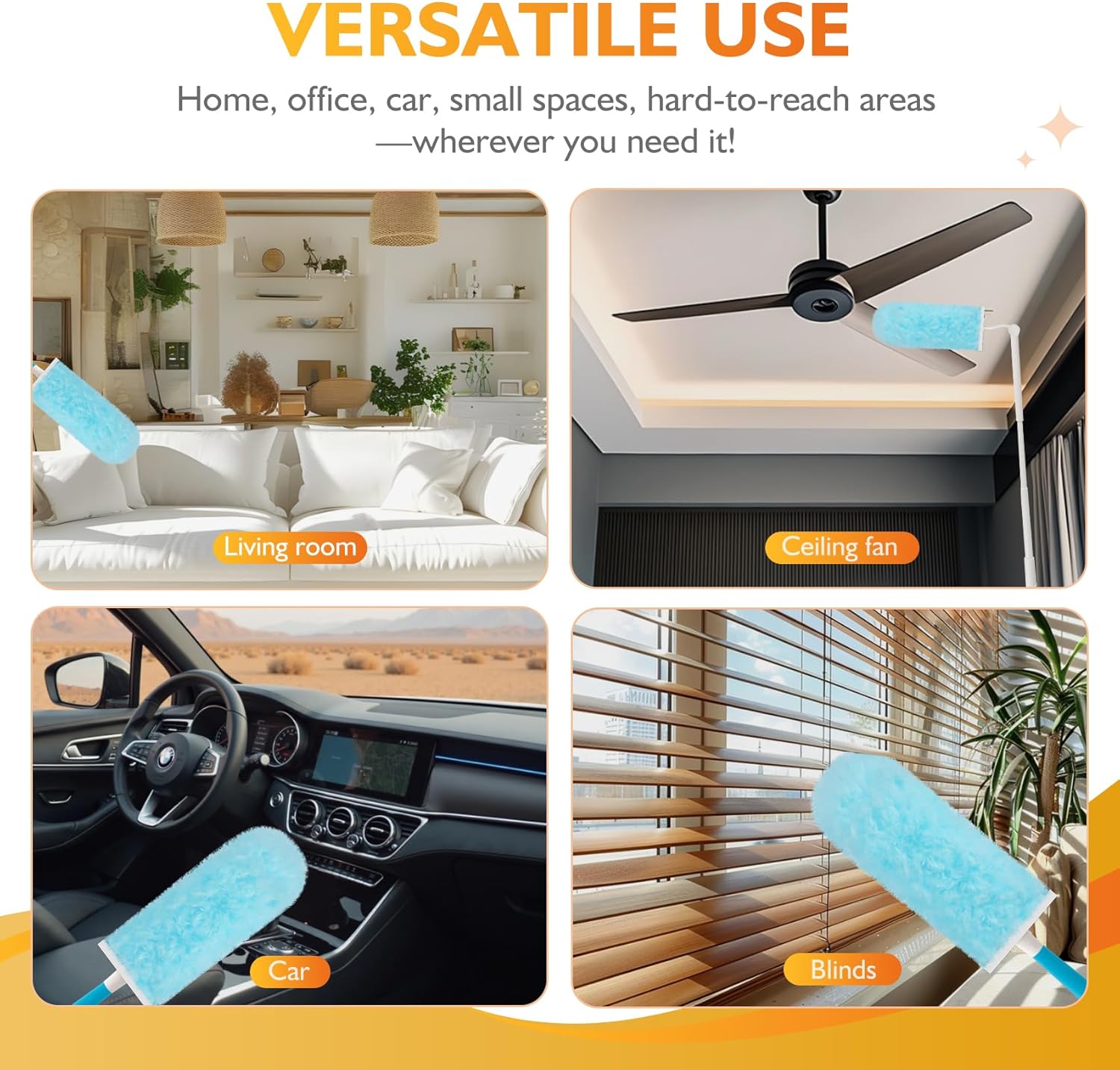 - EASY ASSEMBLY, MULTI-SCENE USE: The extendable duster refills only require simple assembly for effortless cleaning. This versatile duster is suitable for dusting cobwebs, furniture, desks, walls in homes or offices, as well as hard-to-access spots such as vents, ceilings, blinds, cars, and even as a ceiling fan cleaner duster.