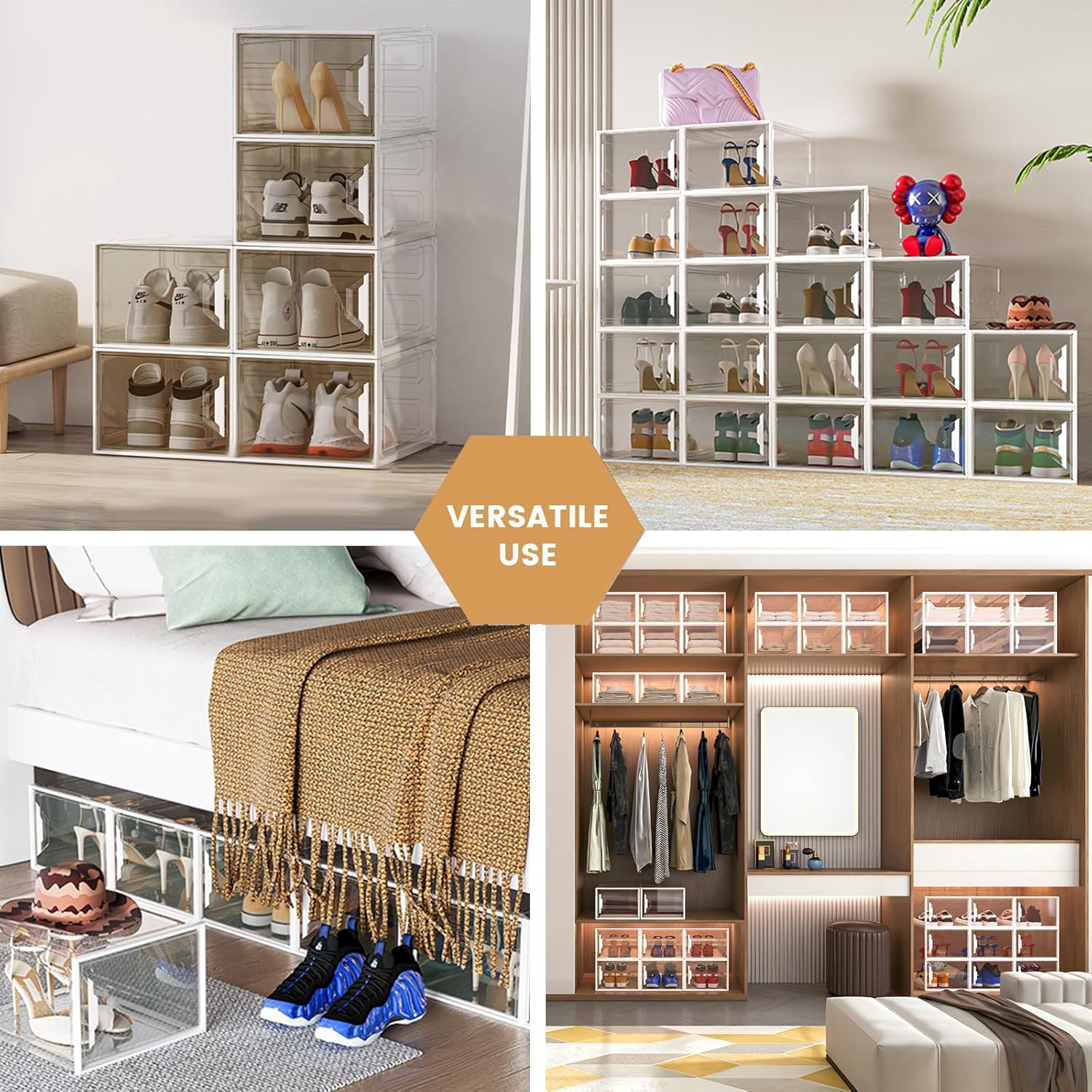- 【Easy Assembly & Magnetic Door】: Featuring modular snap-fit design locks securely into preset grooves with a click, our shoe boxes assemble effortlessly without tools using installation instructions. Stack freely with magnetic side doors and recessed handles for one-handed access. High-clarity panels provide instant visibility—ideal for displaying special collection shoes, organizing and retrieving shoes in a closet.