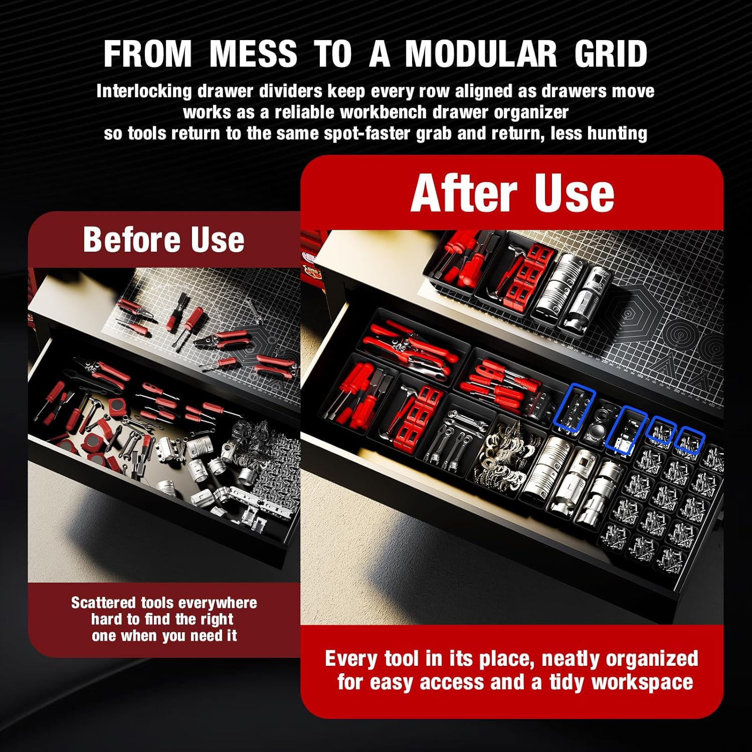 - 【Interlocking Modular Design for Flexible Layout】 Interlocking drawer organizer design allows stacking or separate use, maximizing space in garage drawer organizers, tool box dividers, tool cart compartments, and workbench organizers. Supports modular setups like toolbox organizers and storage, tool grid organizer for tool box, or tool box accessories.