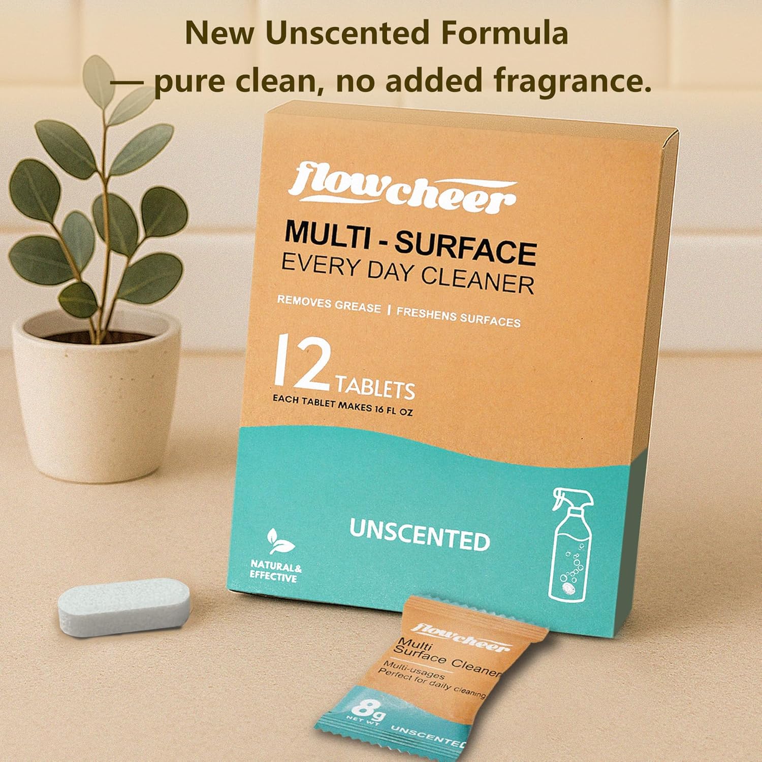 - MULTI-SURFACE CLEANER REFILL: All purpose cleaner tablets do not only Save Space in your cabinet,but also re-fill your bottles repeatly and save your money to buy bulk traditional cleaners.Simply add a FLOWCHEER all-purpose cleaning tablet to water in a reusable spray bottle and you're off to a clean house.