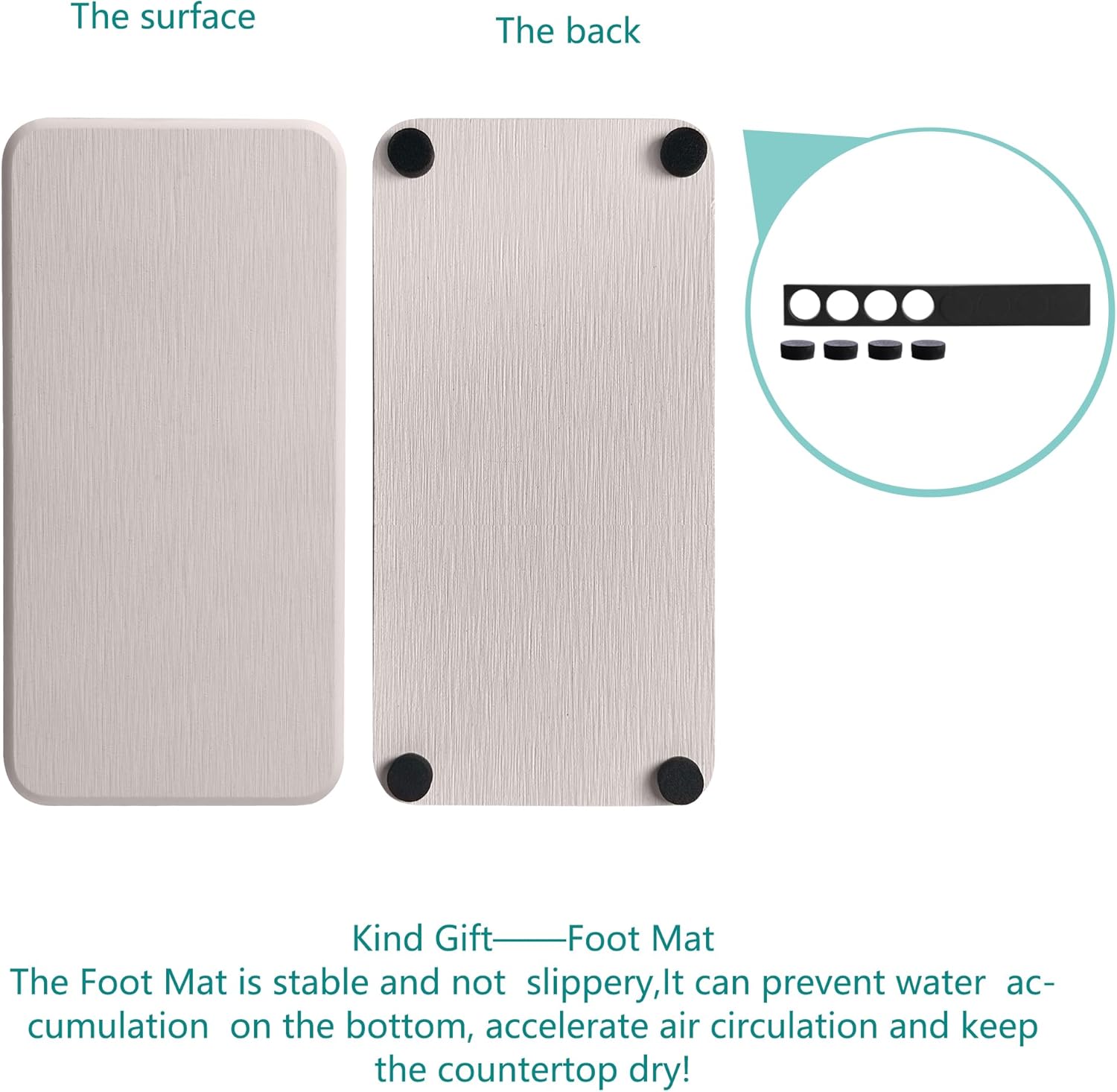 - Made from natural Diatom mud and plant fiber, small holes within diatomite enable it have amazing water absorption. They could absorb water and gets dry in a few minutes. It makes the Bathroom Counter top more dry and tidy.