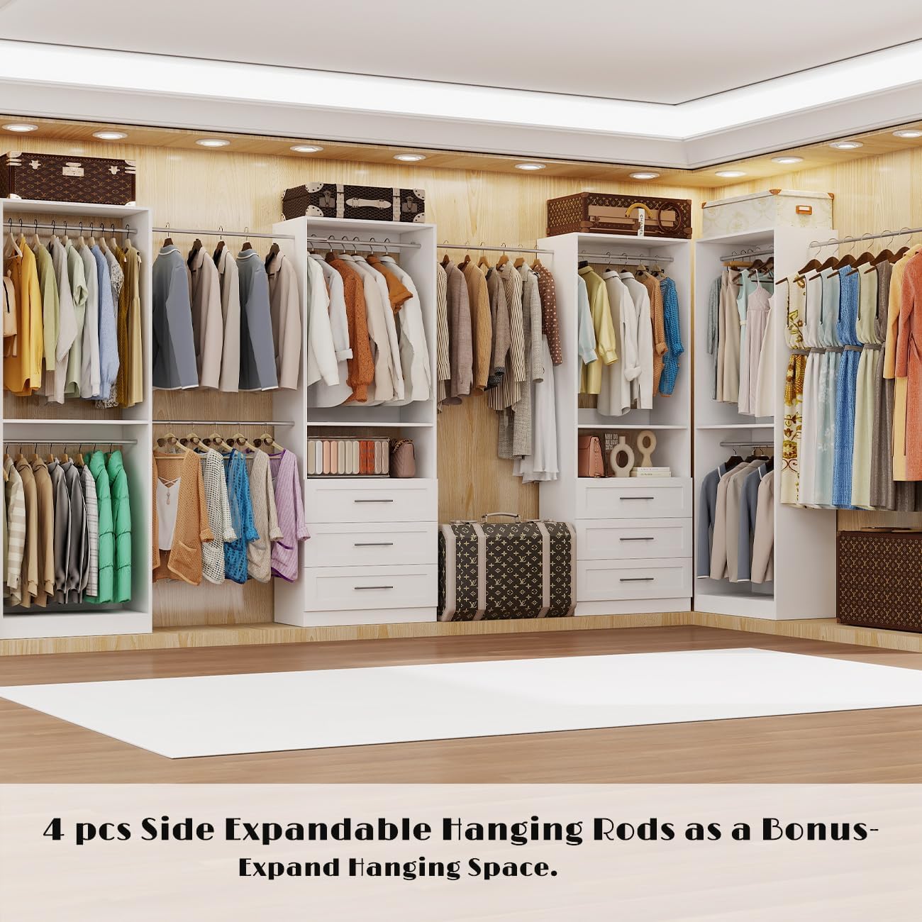 Closet System with 4 Sets, 8FT Closet Organizer Systems with 6 Wooden Drawers & 10 Hanging Rods, Walk in Closet Standalone Corner Closet System Modular Closet System Set White (8FT)