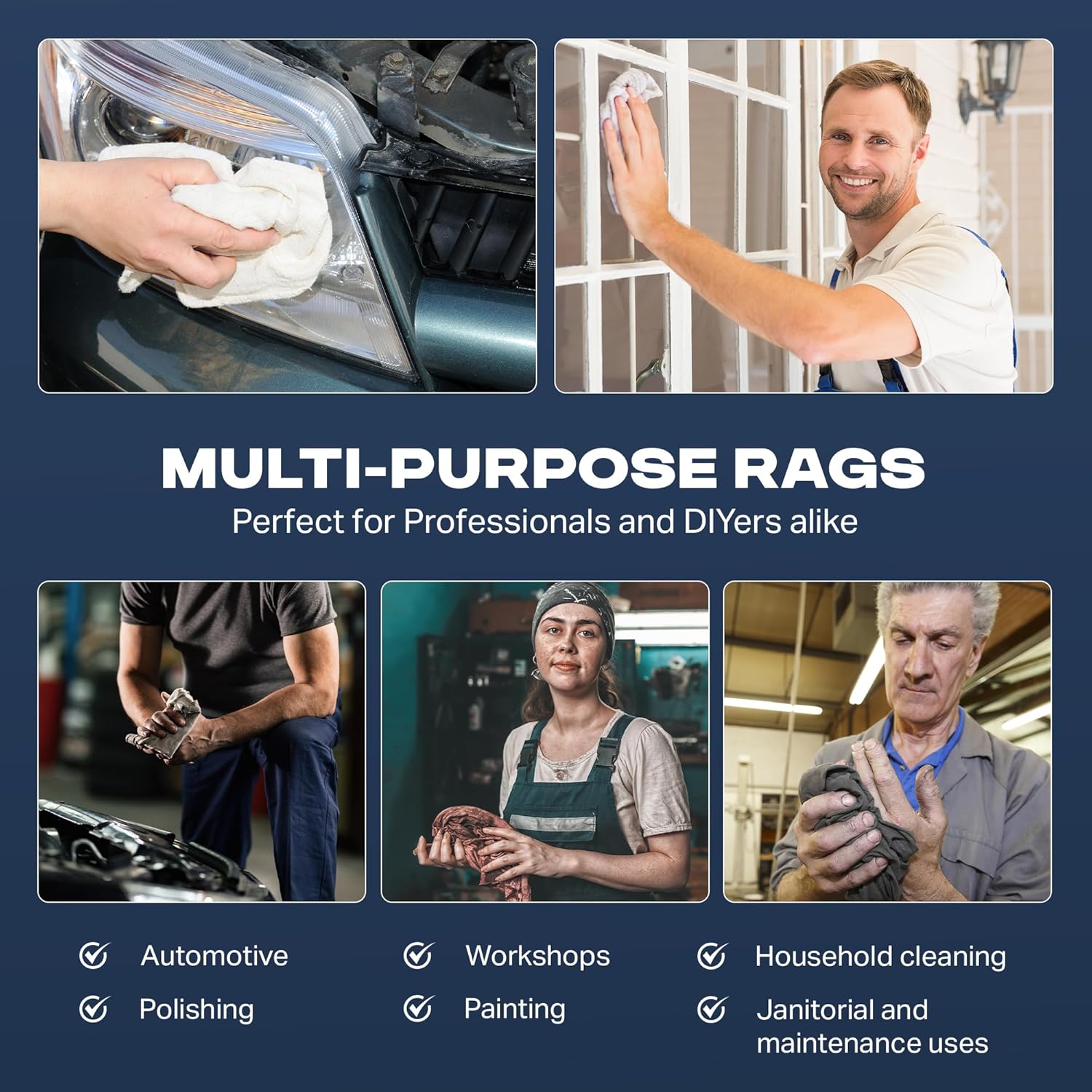 - Ultimate Multi-Purpose Cleaning Rags: This 5lb box of rags includes premium recycled cotton and poly-cotton multi-colored t-shirt rags for cleaning a wide variety of messes. Use these soft yet strong shop rags to wipe down tools, soak up spills, or clean grease and grime in garages, auto shops, homes, and industrial settings.